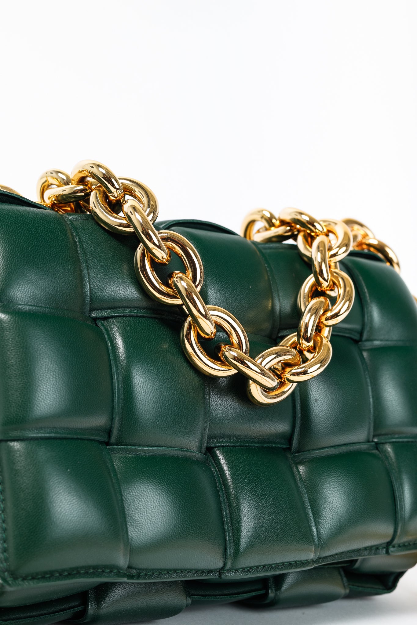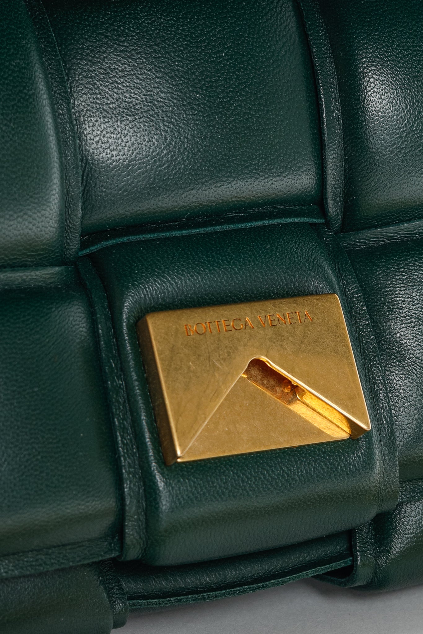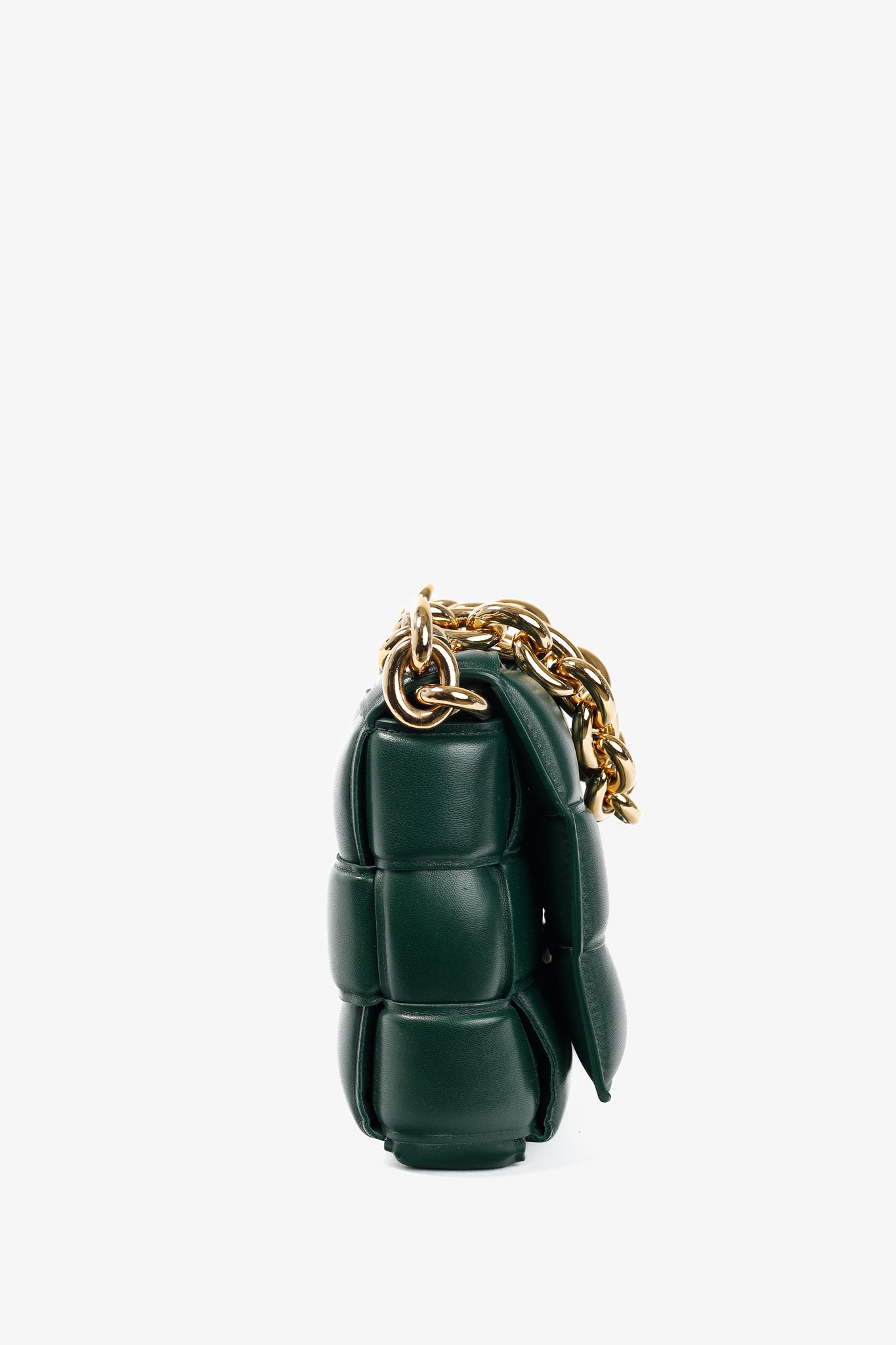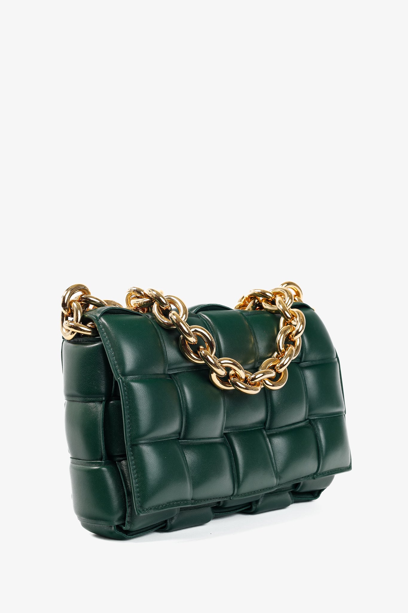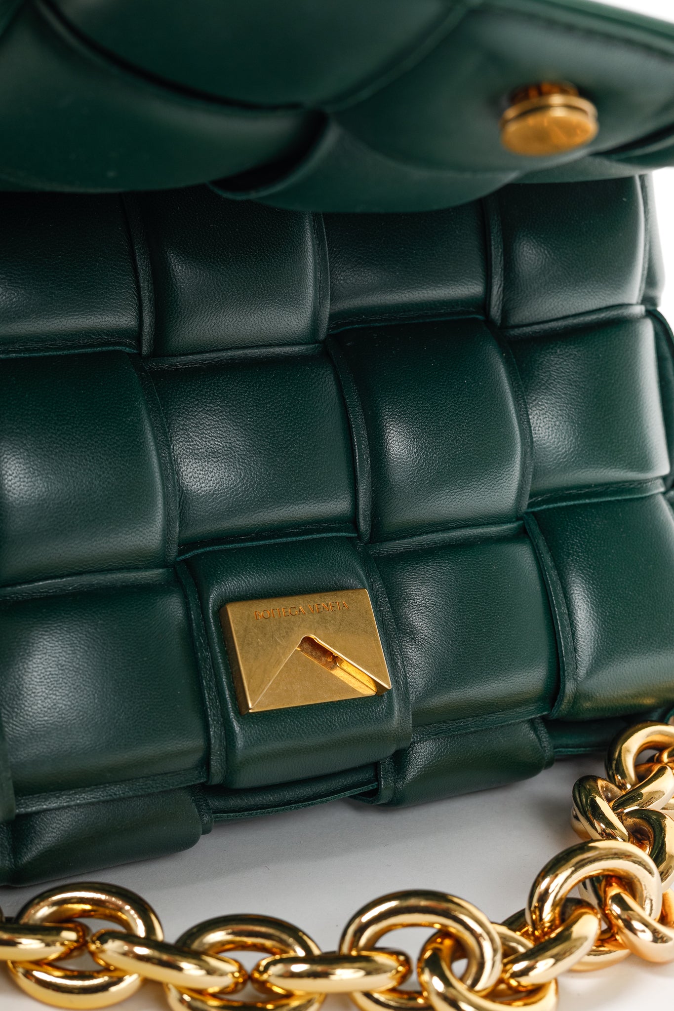 Made in Italy, this Chain Cassette bag from Bottega Veneta circa 2021 is crafted with a double-face intrecciato nappa lambskin leather in a Raintree green, and features polished gold-tone hardware, a chunky chain-link shoulder strap, a chunky chain-link top handle, a front flap with slide-lock fastening, and an interior zip pocket.