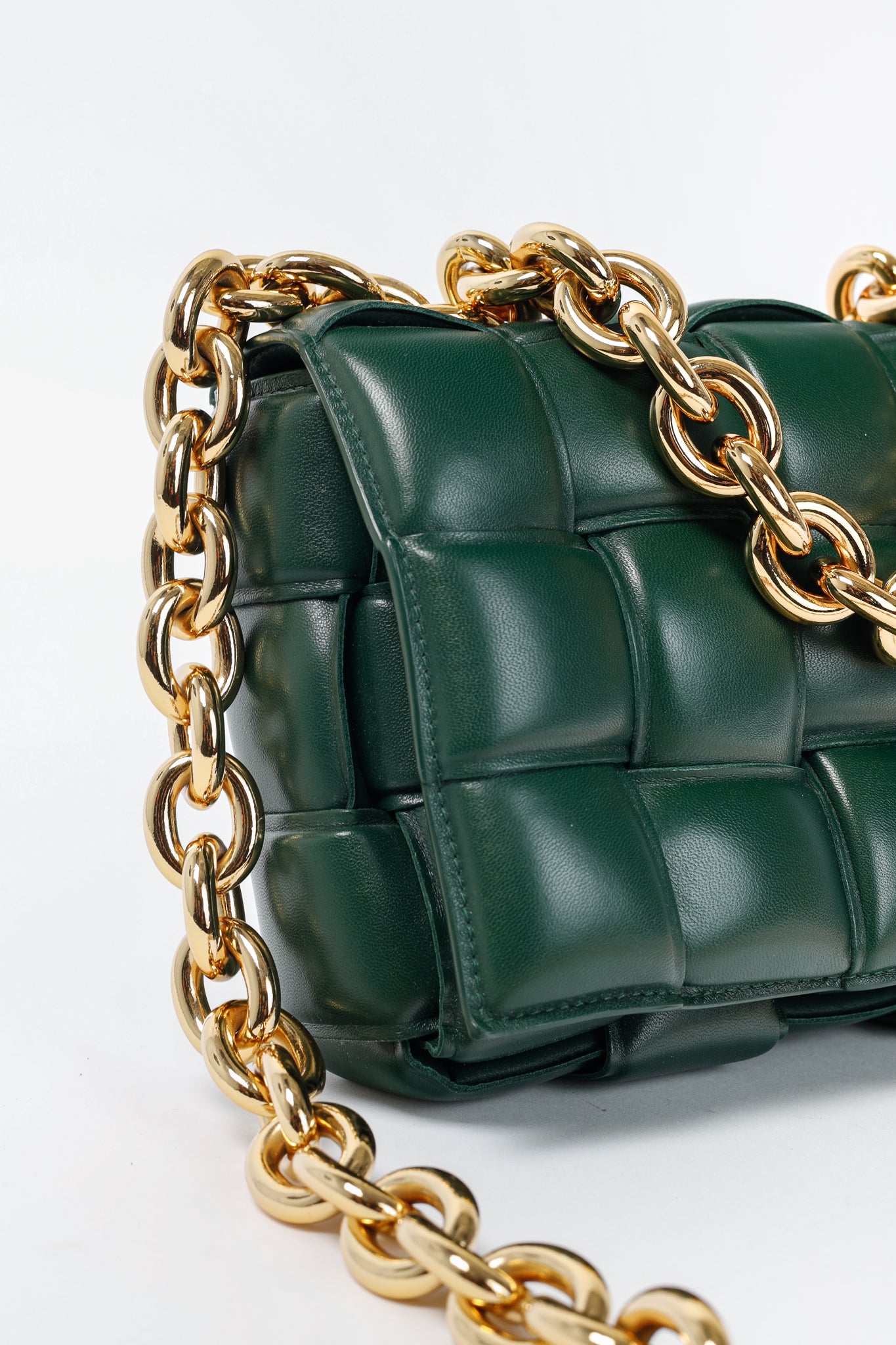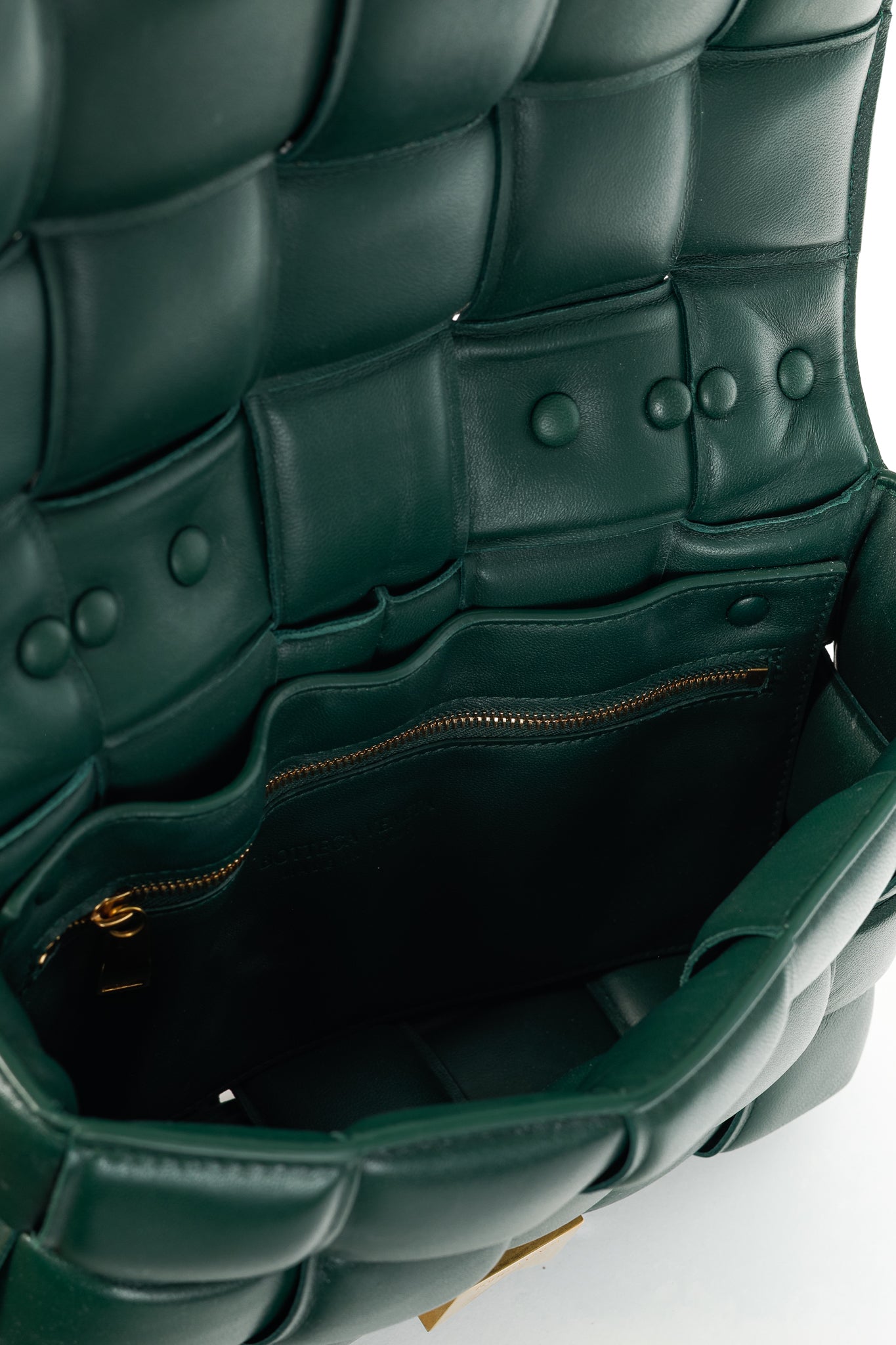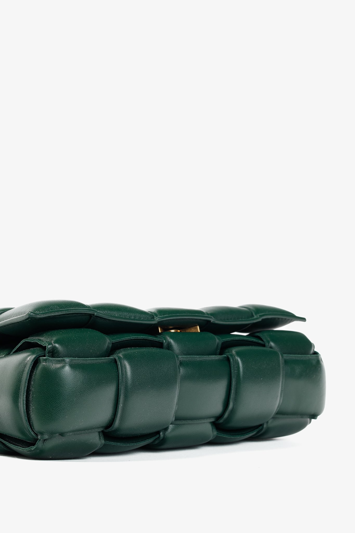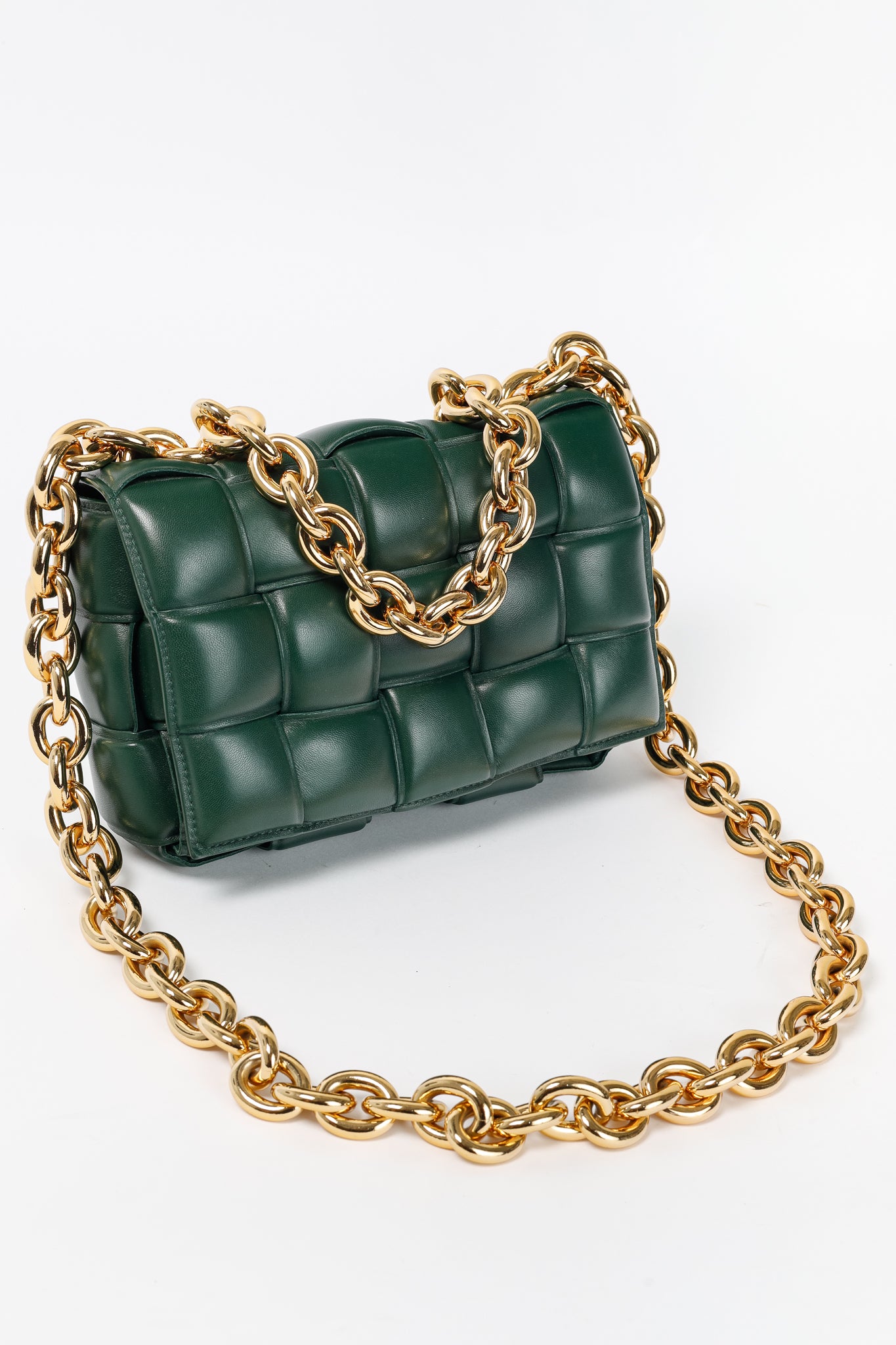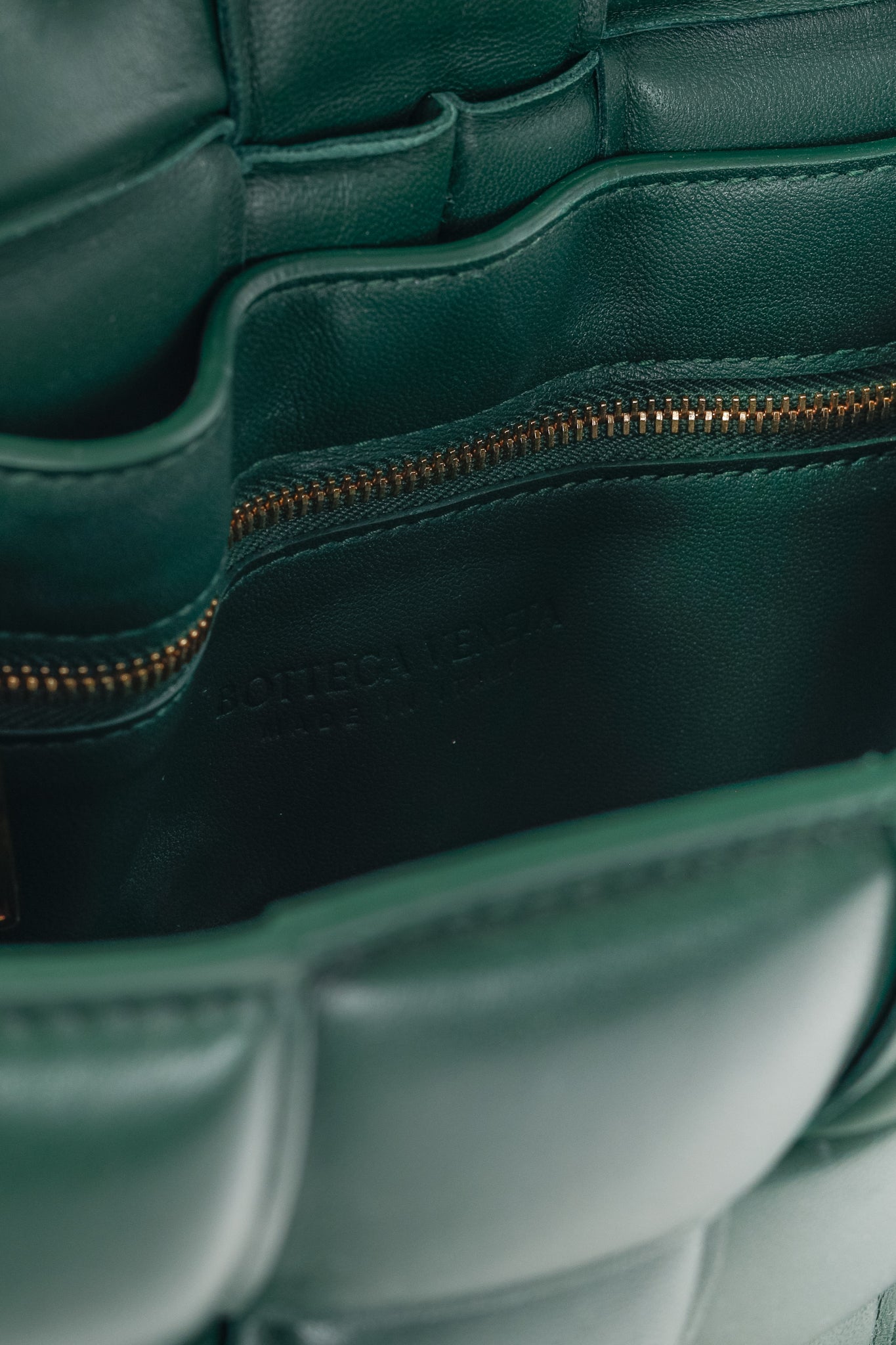 Made in Italy, this Chain Cassette bag from Bottega Veneta circa 2021 is crafted with a double-face intrecciato nappa lambskin leather in a Raintree green, and features polished gold-tone hardware, a chunky chain-link shoulder strap, a chunky chain-link top handle, a front flap with slide-lock fastening, and an interior zip pocket.