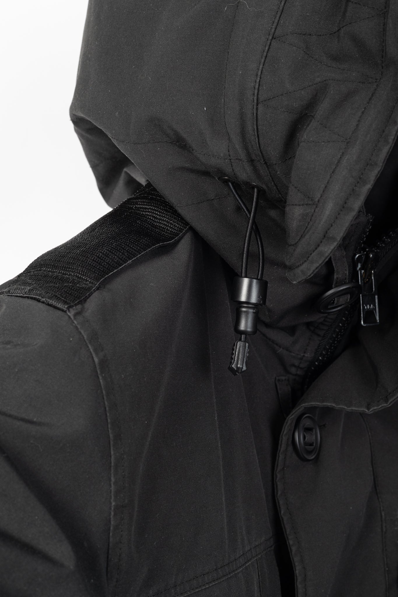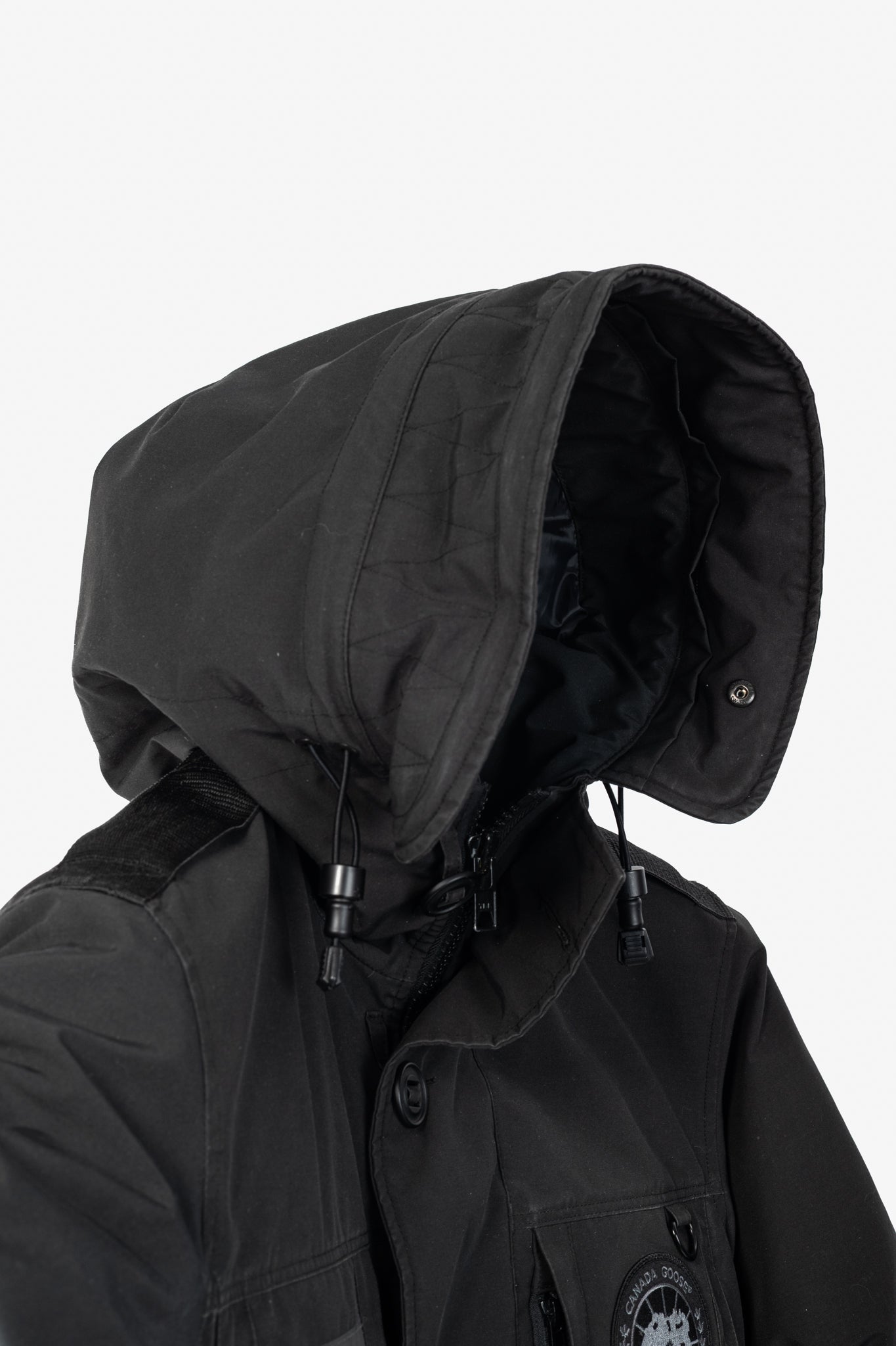 Made in Canada, this Macculloch parka from Canada Goose's Black Label is crafted in a Black cotton blend insulated with a soft down, and is trimmed with signature double-stripe reflective details on the back of hood and right chest pocket to add visibility in low light. It features long sleeves, reinforced elbows to add durability in high-abrasion areas, recessed rib-knit cuffs to add comfort and lock in heat, webbed trim on the shoulders, an adjustable down-filled hood with shaping wire, a front zip closure with two pulls and a buttoned placket, a D ring attachment on the left chest to hang gloves or provide easy access to necessities, front zip and flap pockets with side hand-warmer pockets on the hips, an interior drawcord at the waist, two-way side zips for ventilation, a webbing grab strap at the upper back with an emblem patch, and is fully lined.