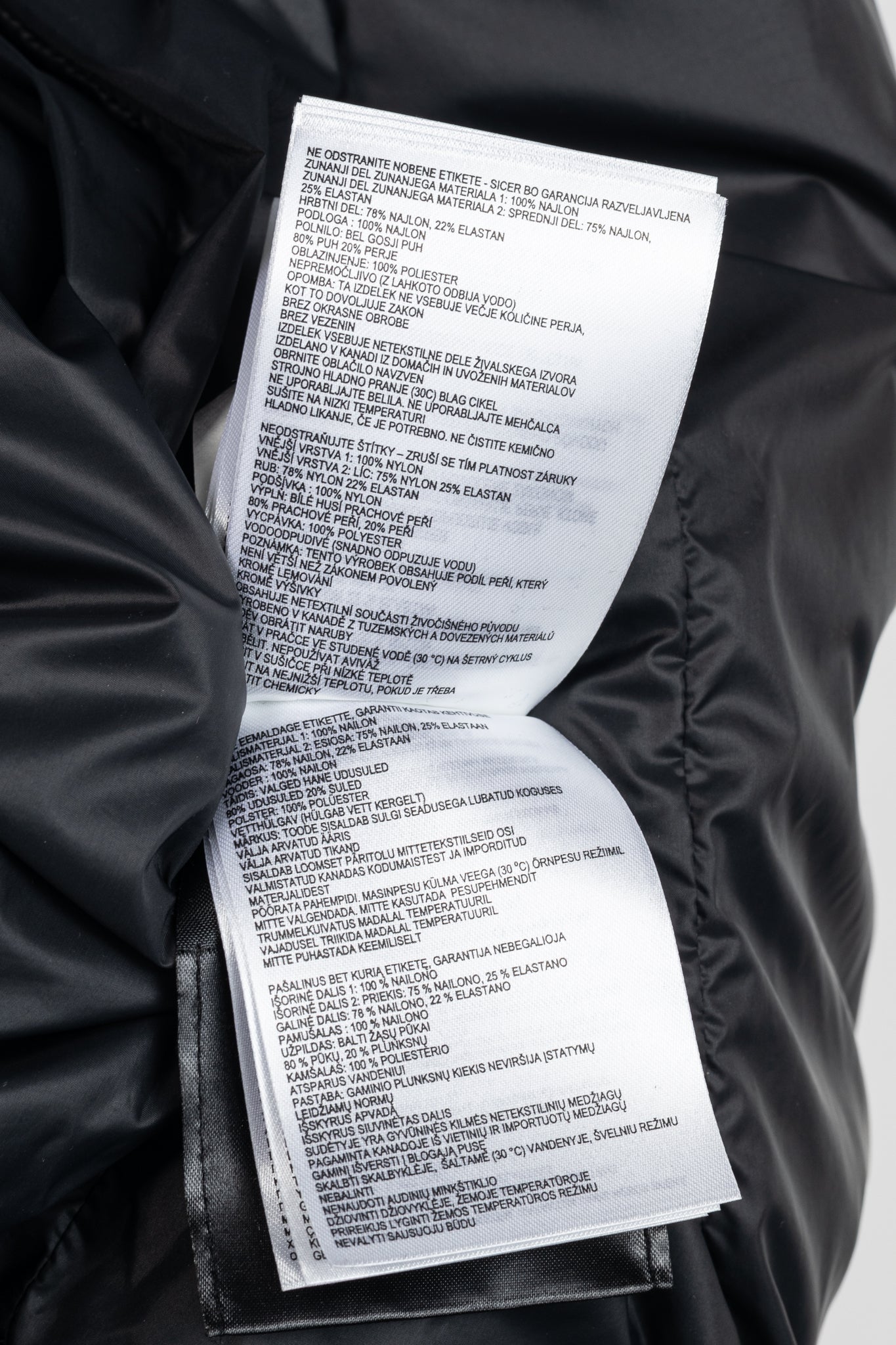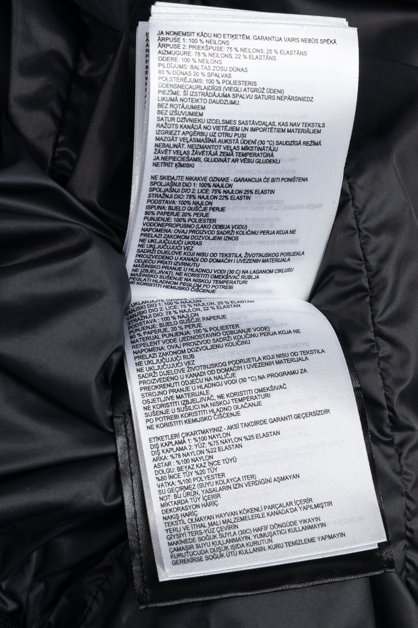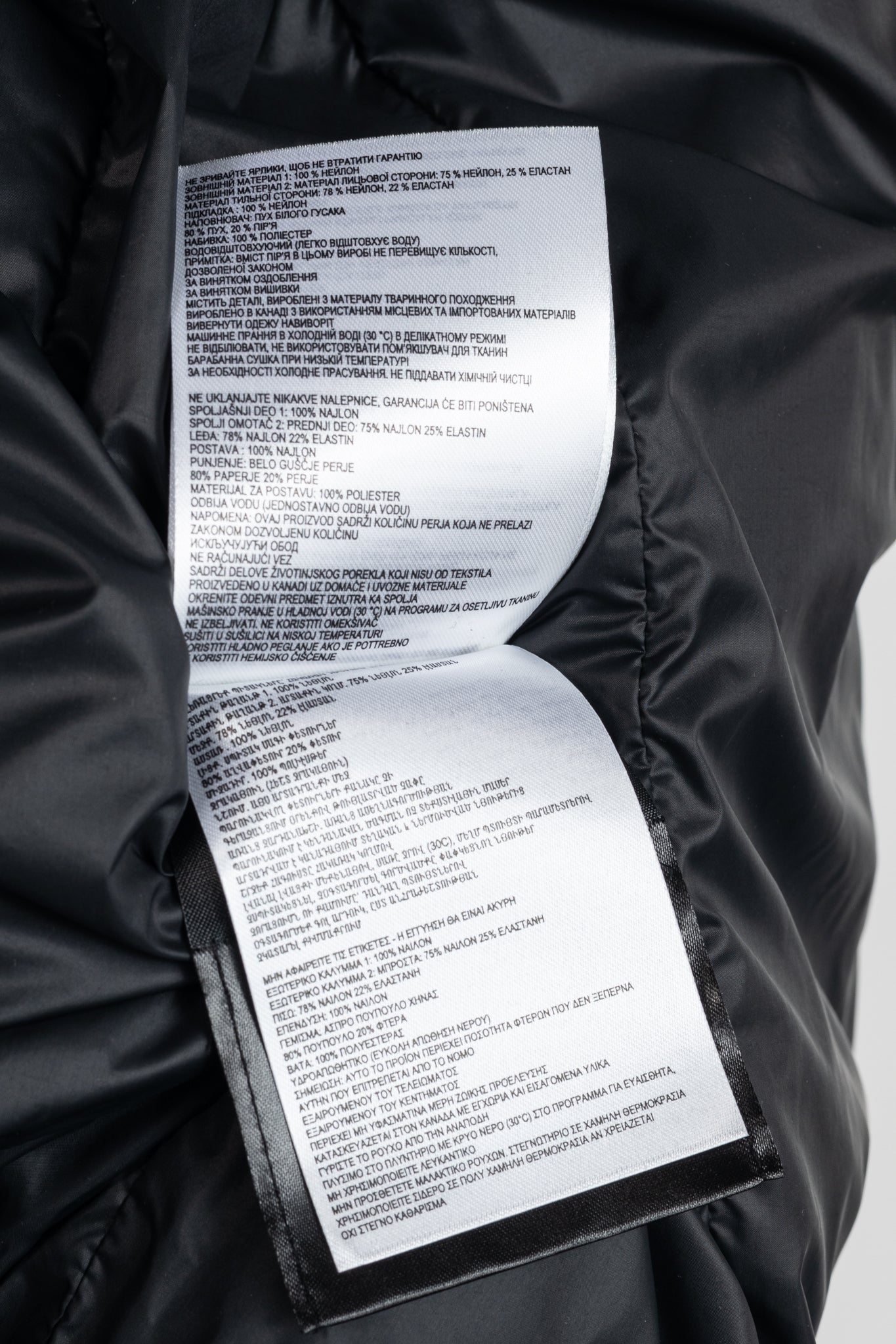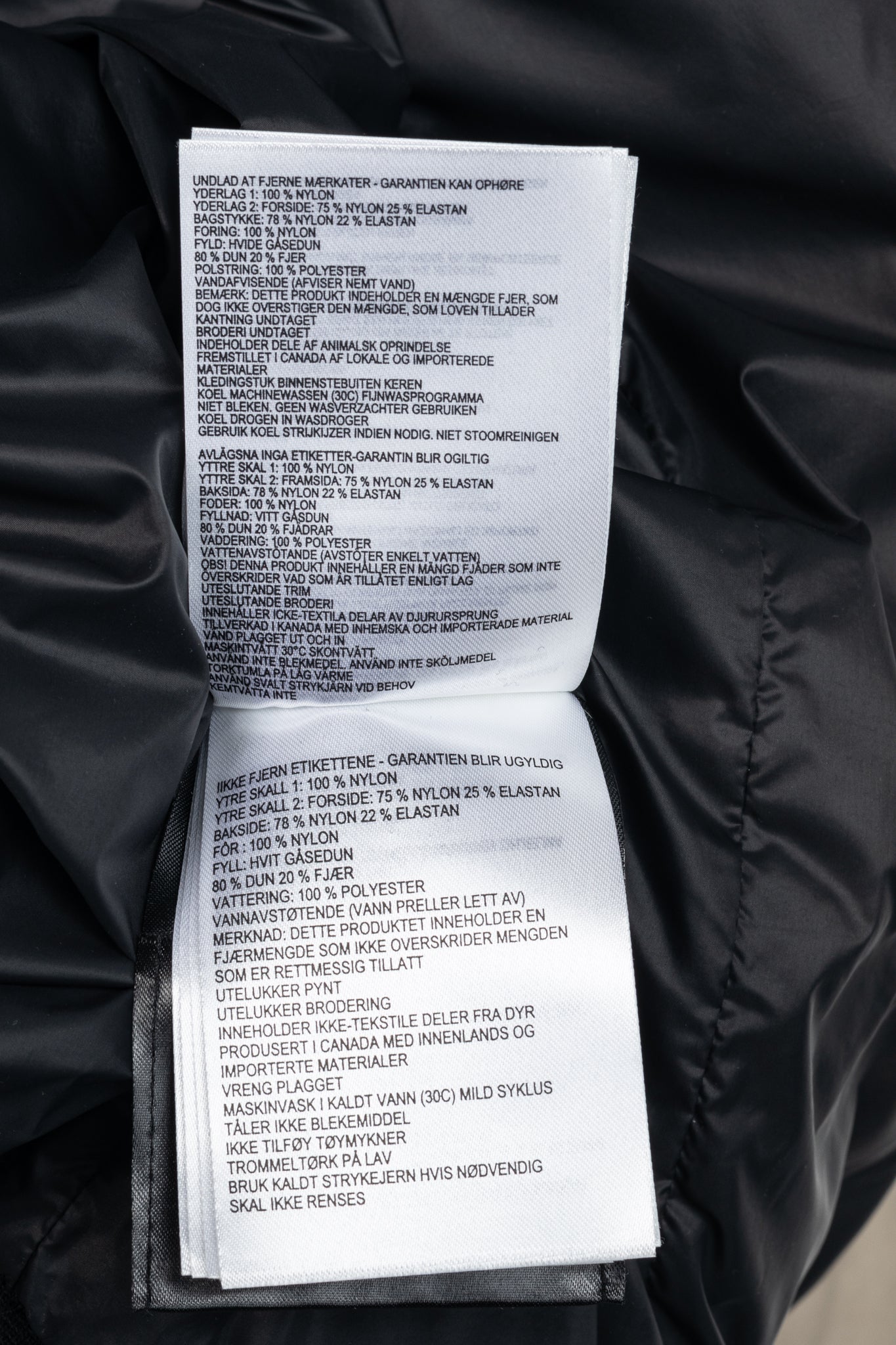 Composition: Outer shell 1: 100% nylon. Outer shell 2, face: 75% nylon, 25% spandex. Outer shell 2, back: 78% nylon, 22% spandex. Lining: 100% nylon. Fill: White goose down (80% down, 20% feather). Padding: 100% polyester.