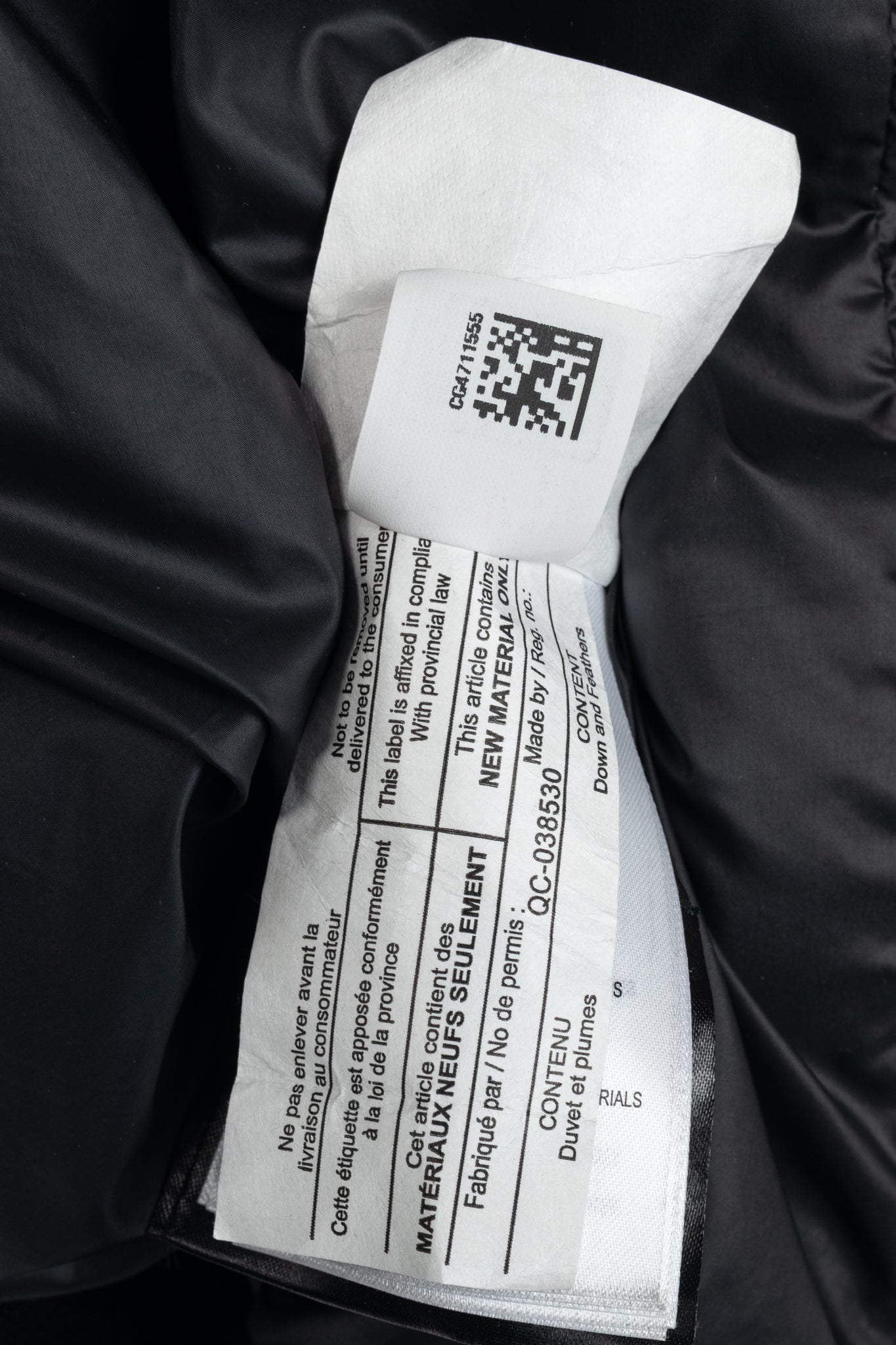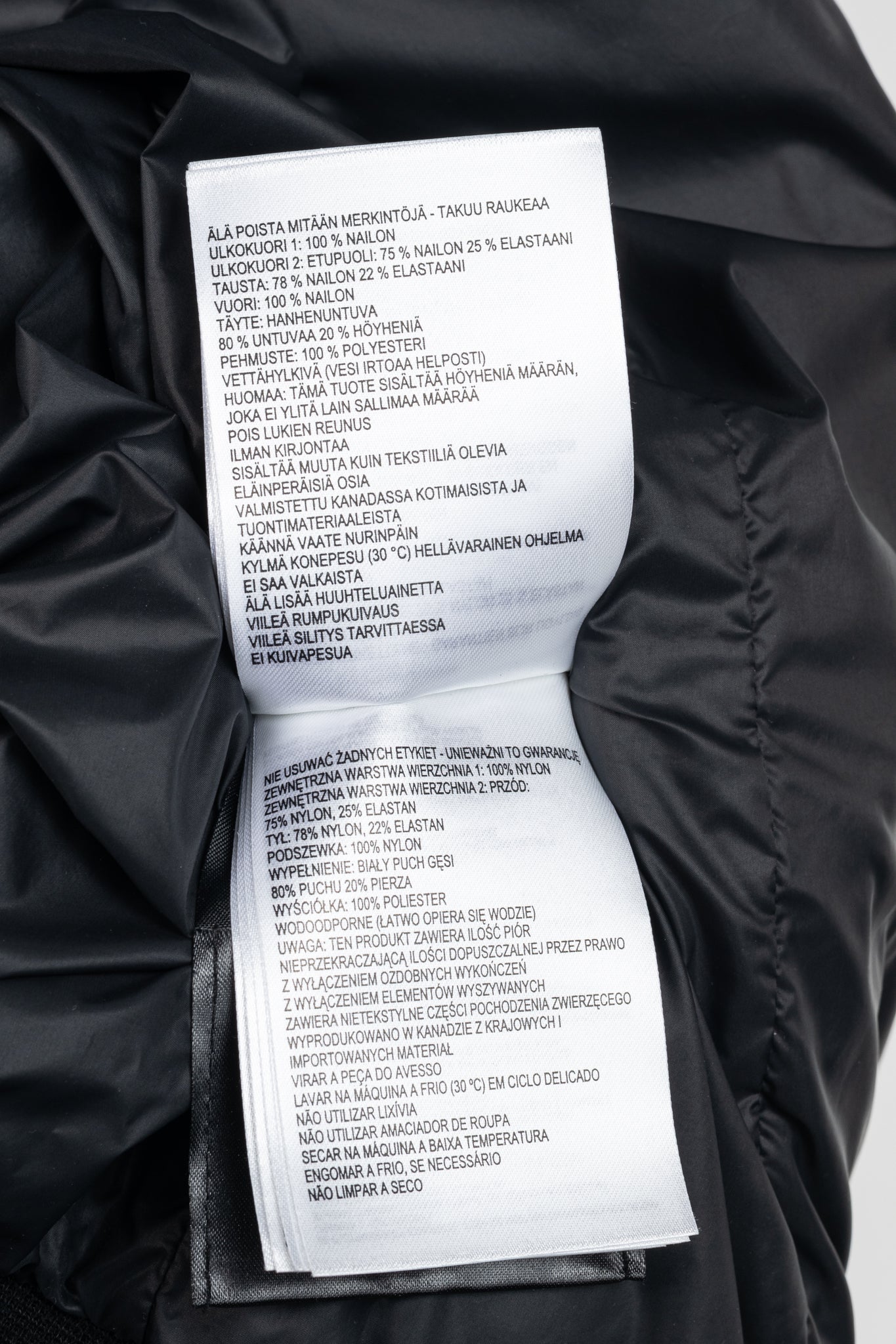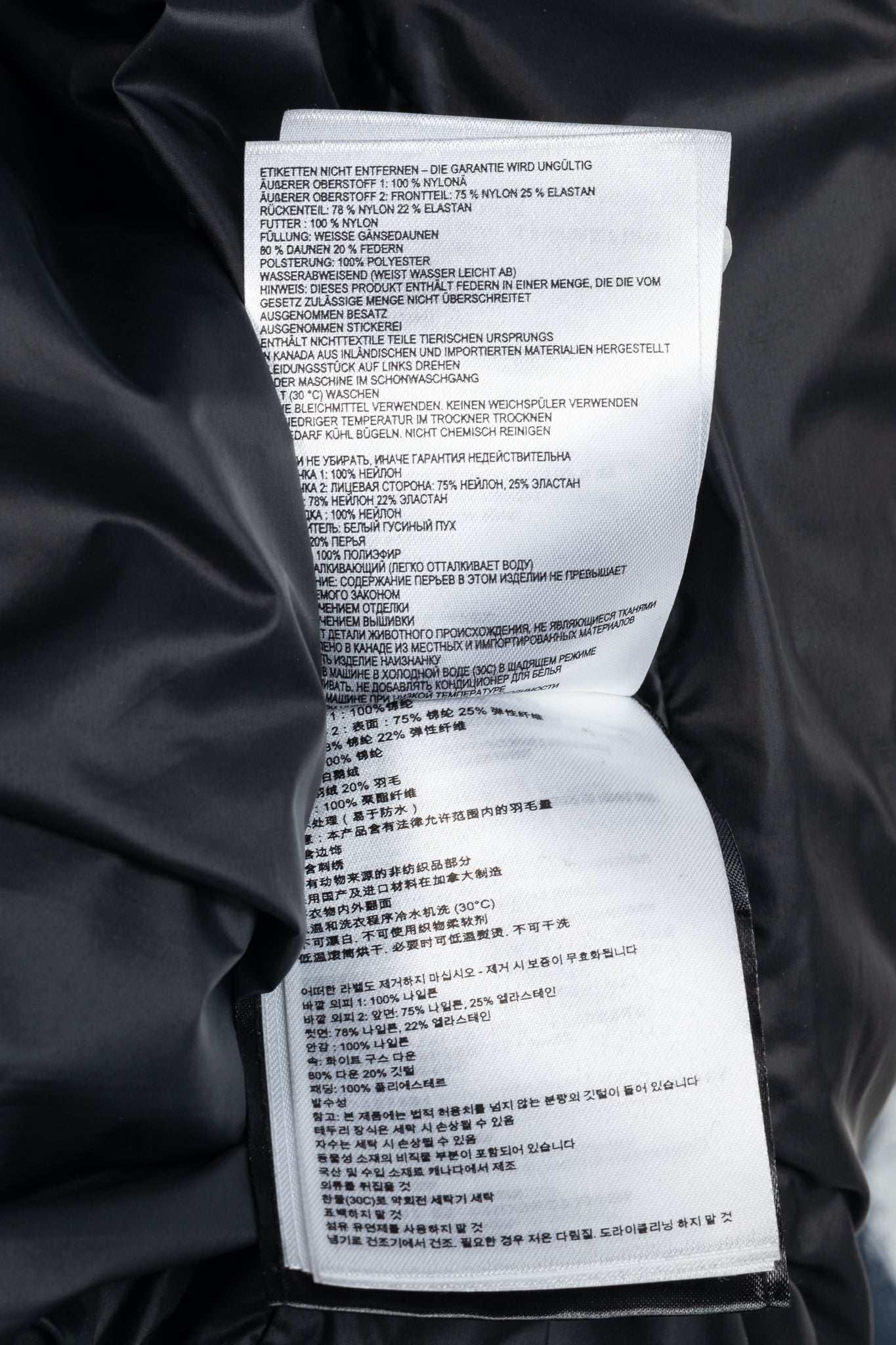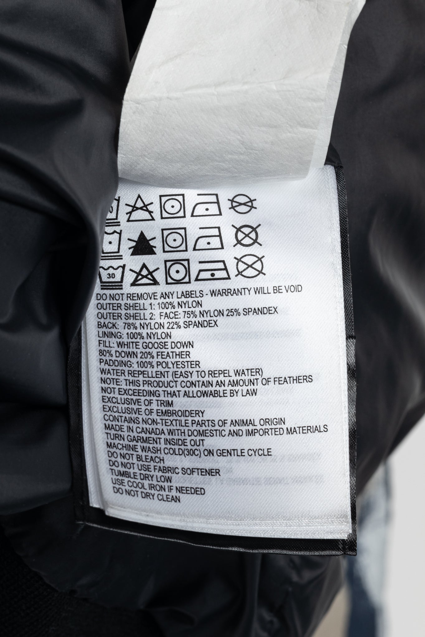 Composition: Outer shell 1: 100% nylon. Outer shell 2, face: 75% nylon, 25% spandex. Outer shell 2, back: 78% nylon, 22% spandex. Lining: 100% nylon. Fill: White goose down (80% down, 20% feather). Padding: 100% polyester.