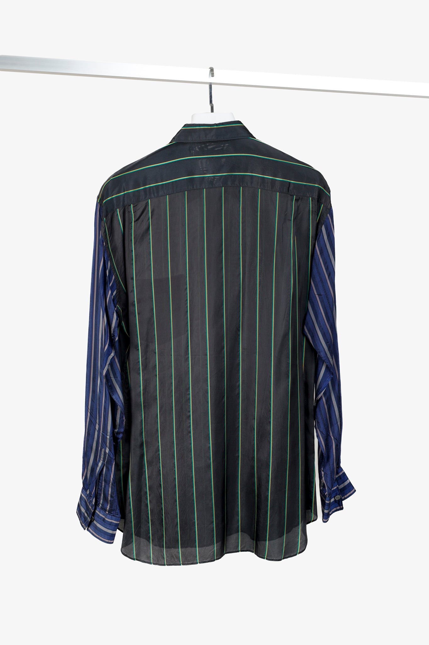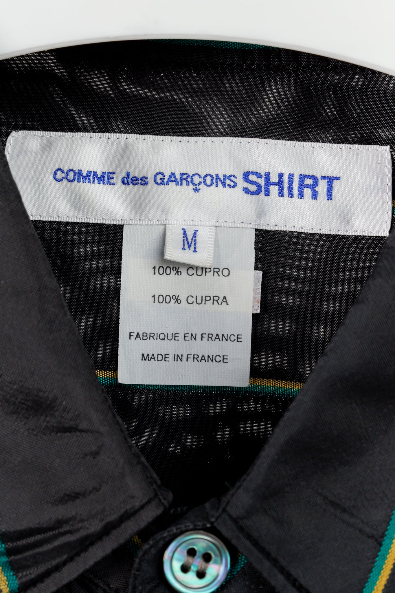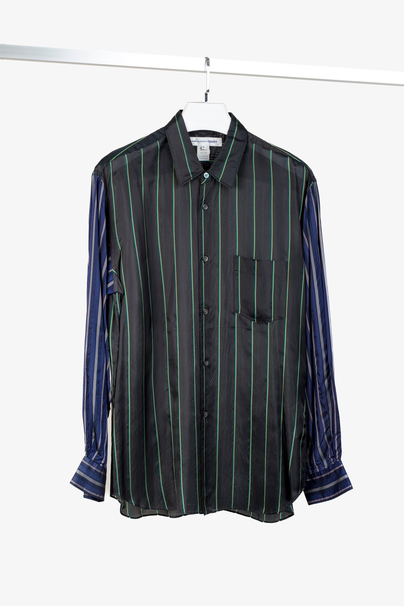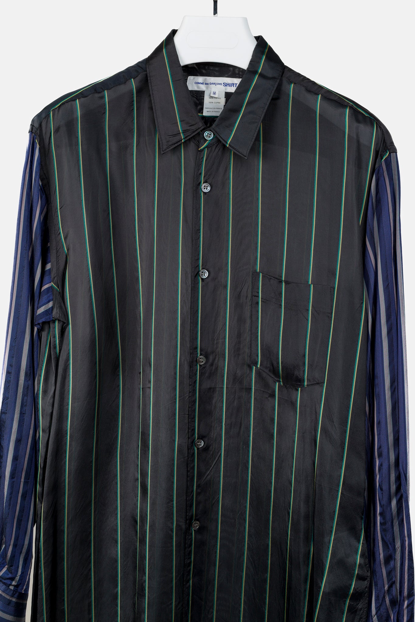 Experience bold and modern style with the Comme des Garçons Shirt Multi-Colour Stripe Button Up. With its black, green, blue, and pink stripes, this shirt is perfect for making a statement. The pointed collar adds a touch of sophistication, while the long sleeve design and cupra fabric ensure comfort and durability. Elevate your wardrobe with this unique piece.