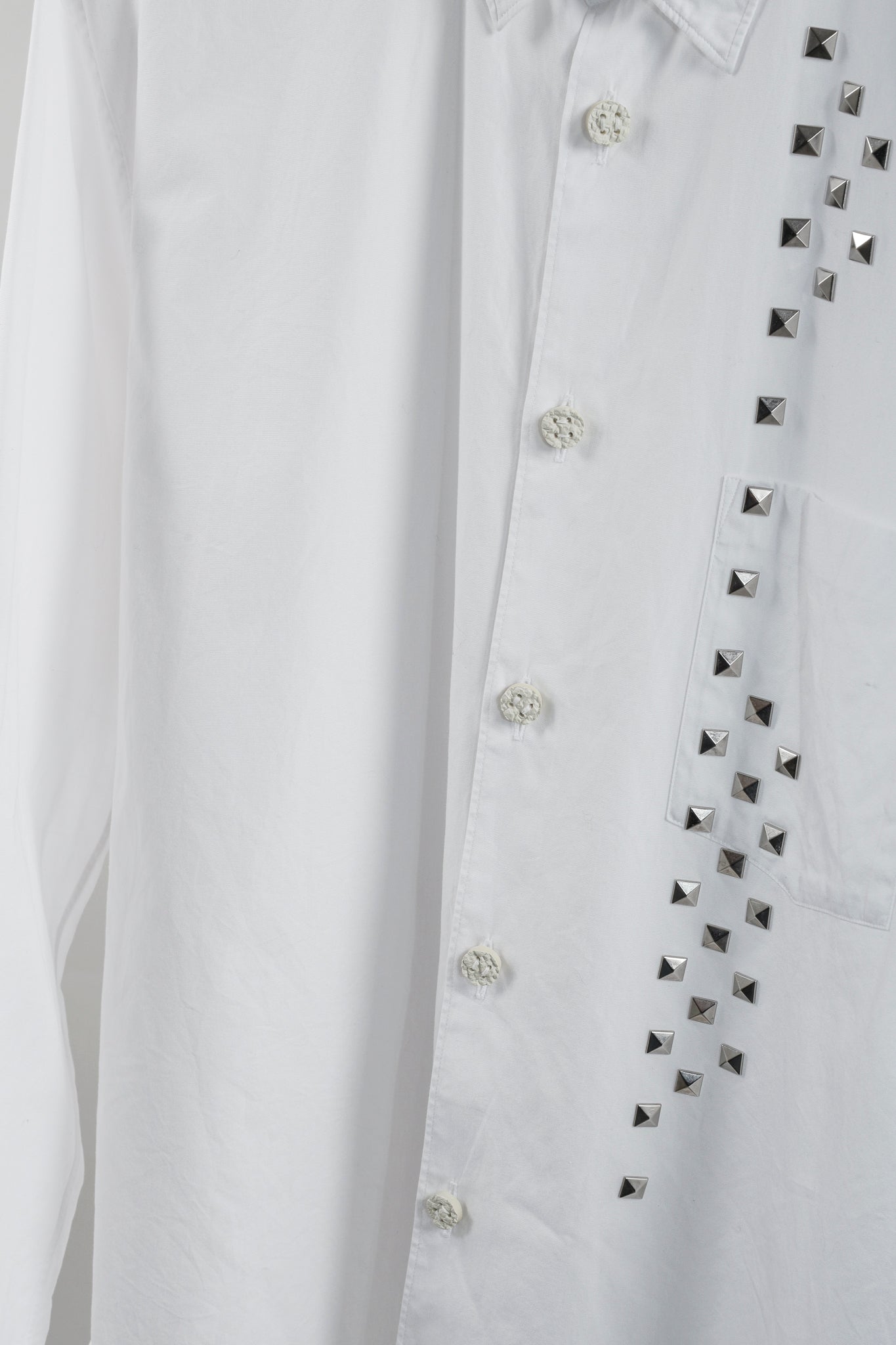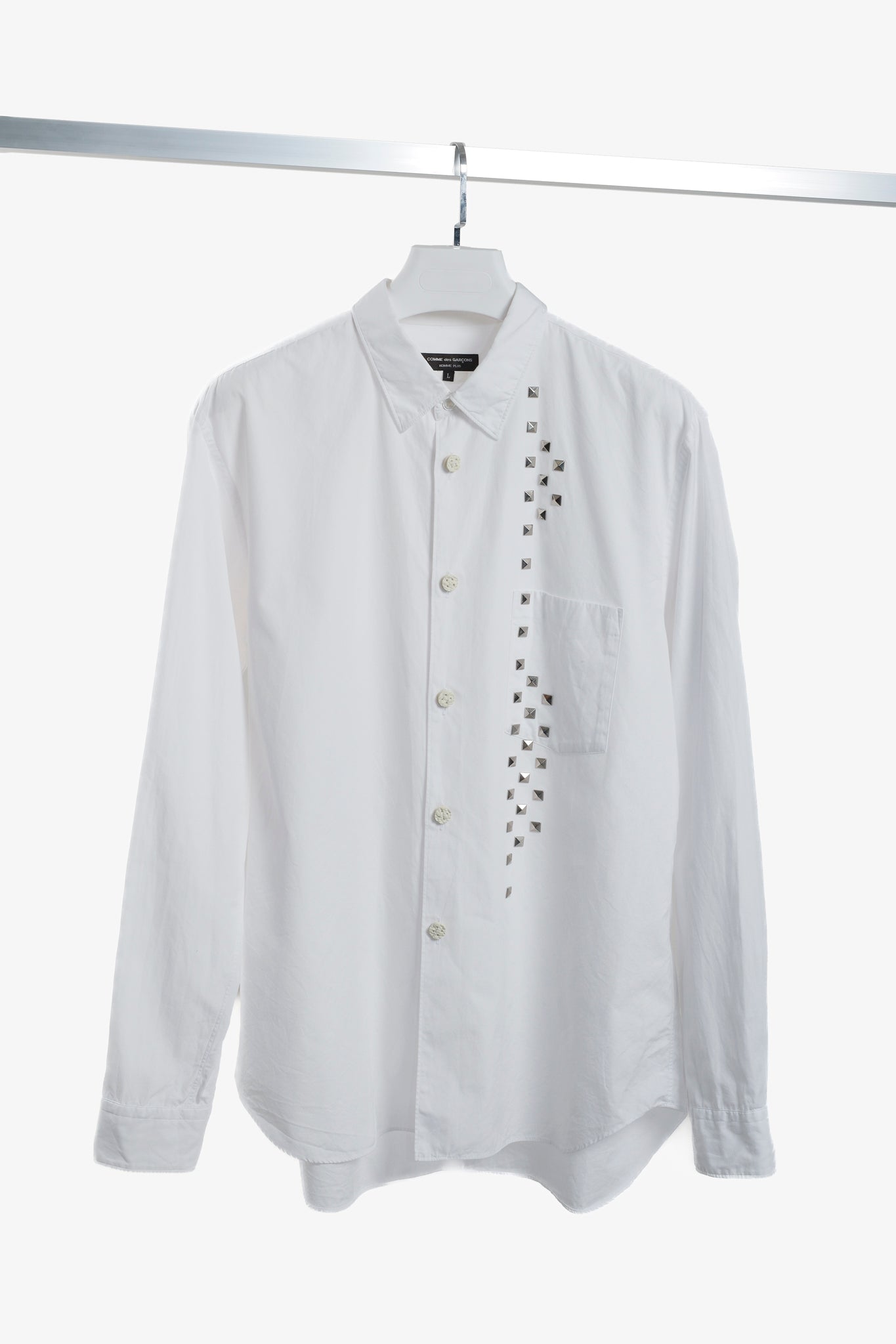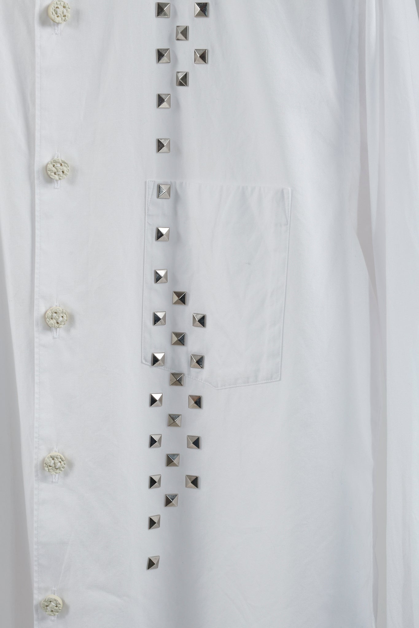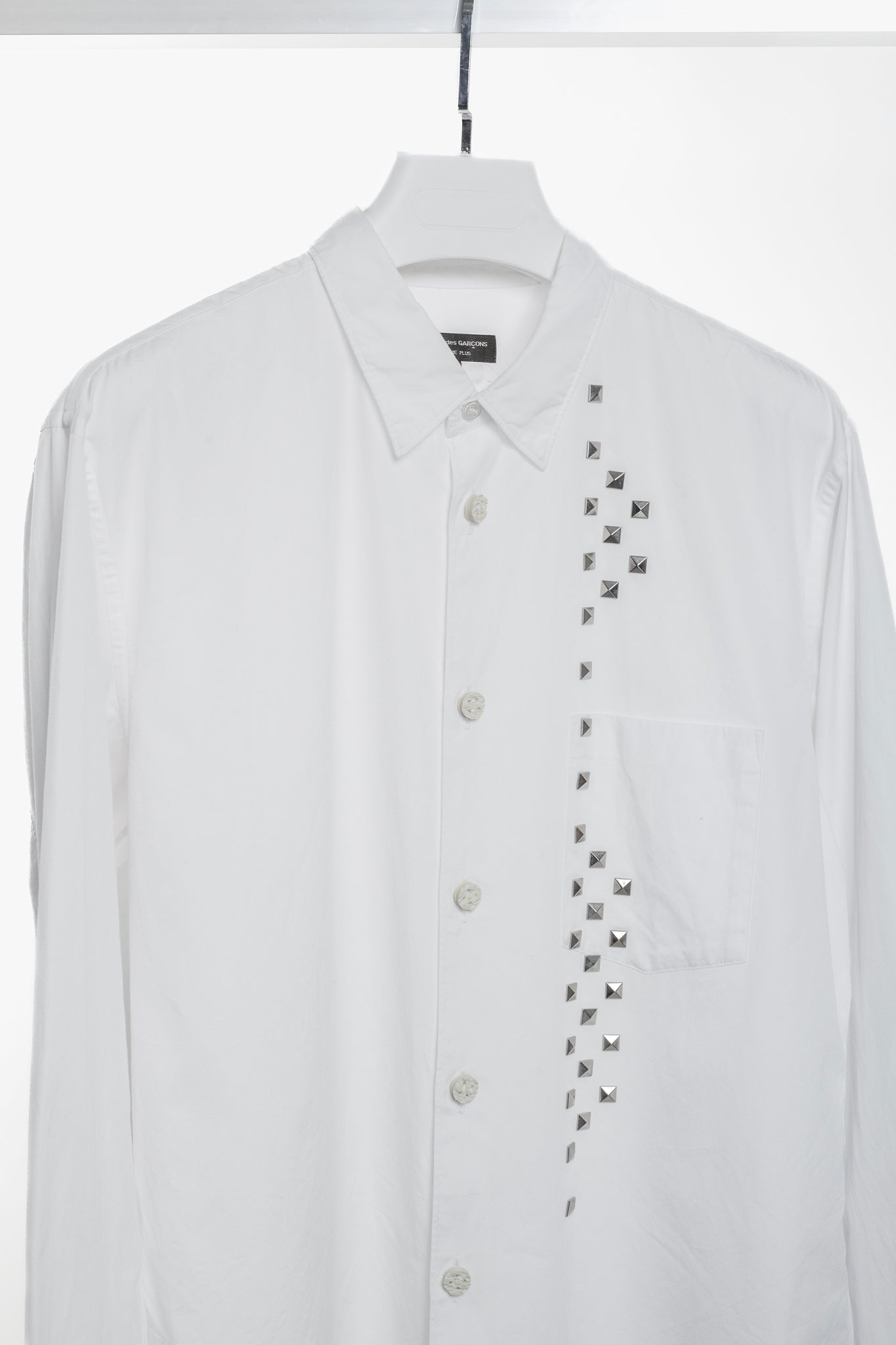 This 2012 studded button down shirt from Comme Des Garcon Homme Plus features a 100% cotton construction, 32 square studs vertically lining the left side of the shirt with a large breast pocket, dress shirt collar, rubber buttons on the cuff and front of the shirt, with a singular plastic collar button.