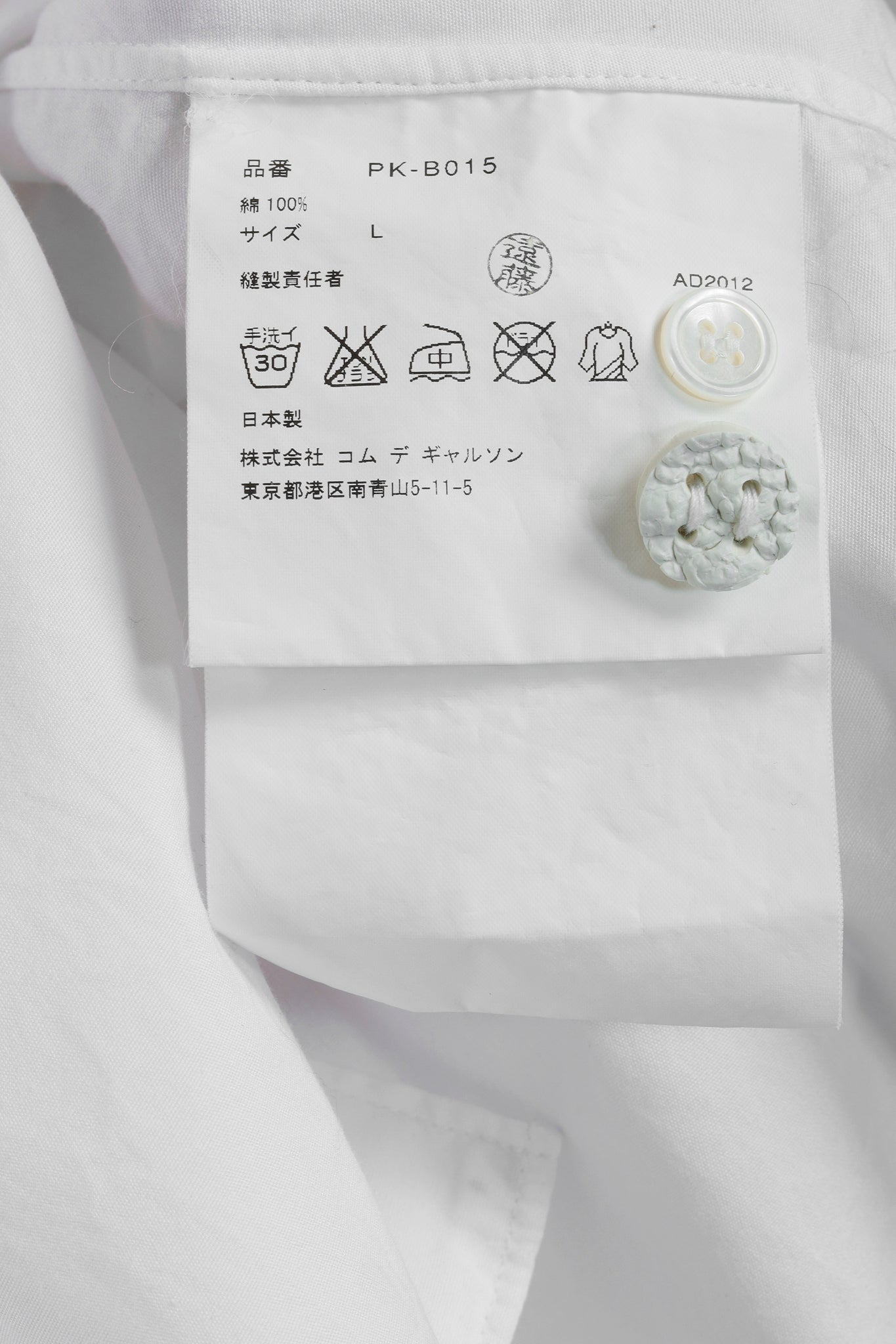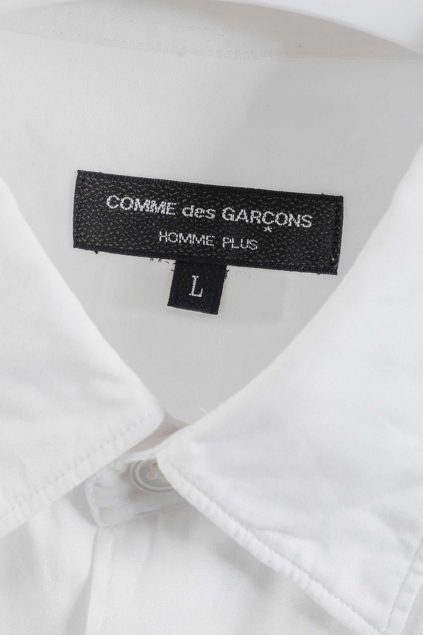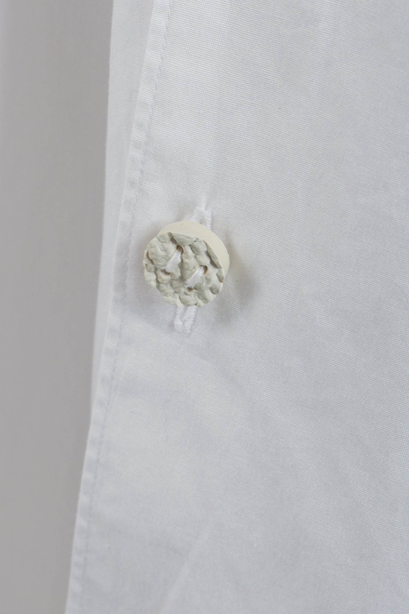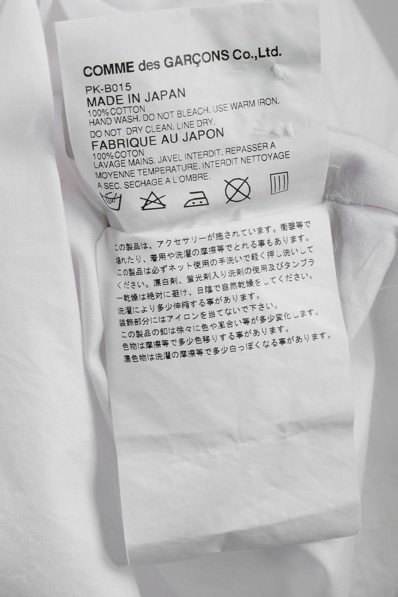 This 2012 studded button down shirt from Comme Des Garcon Homme Plus features a 100% cotton construction, 32 square studs vertically lining the left side of the shirt with a large breast pocket, dress shirt collar, rubber buttons on the cuff and front of the shirt, with a singular plastic collar button.