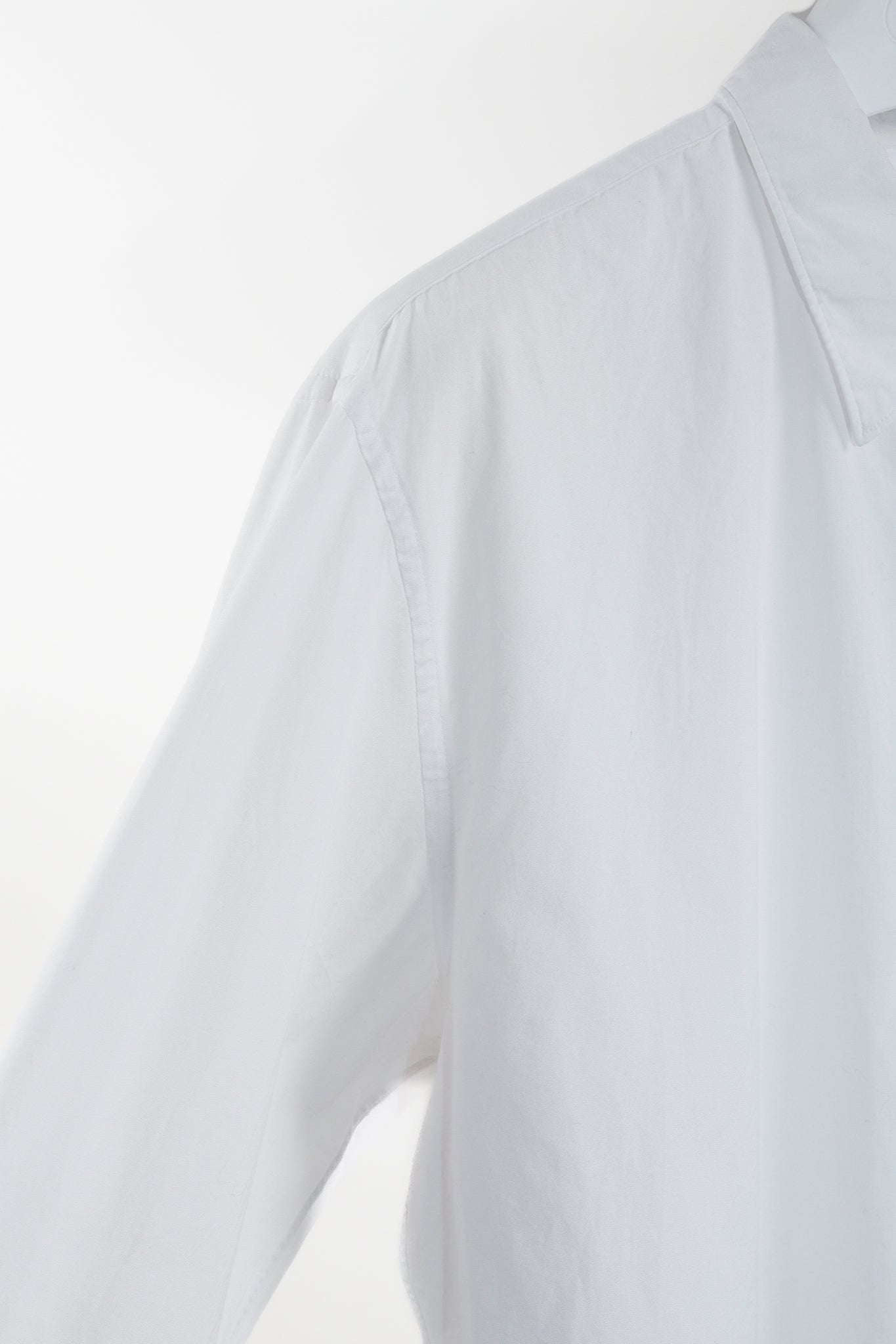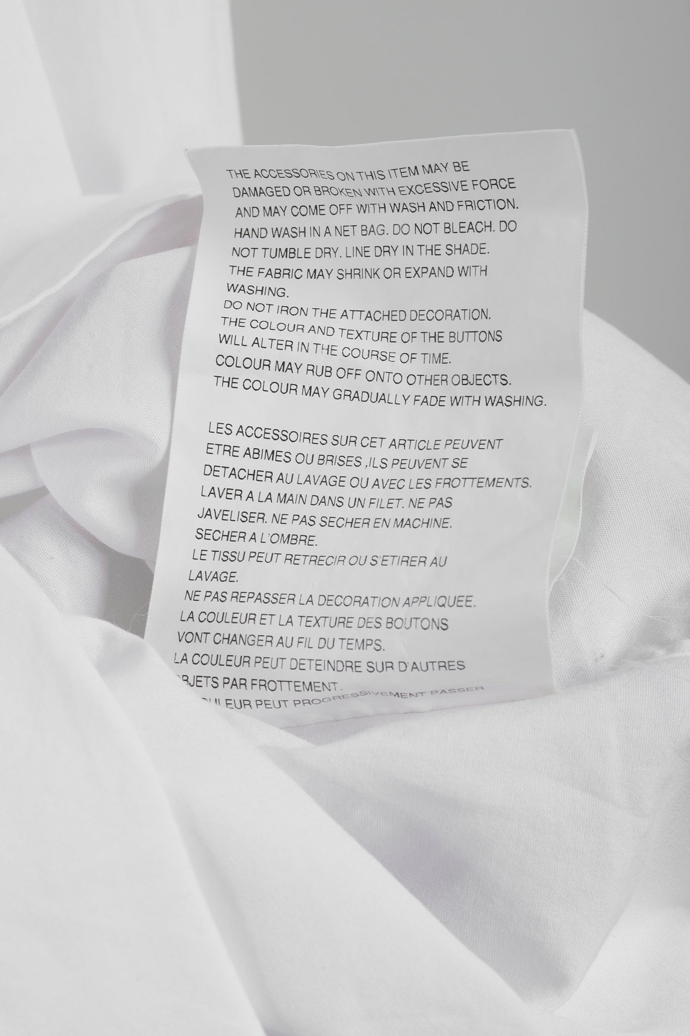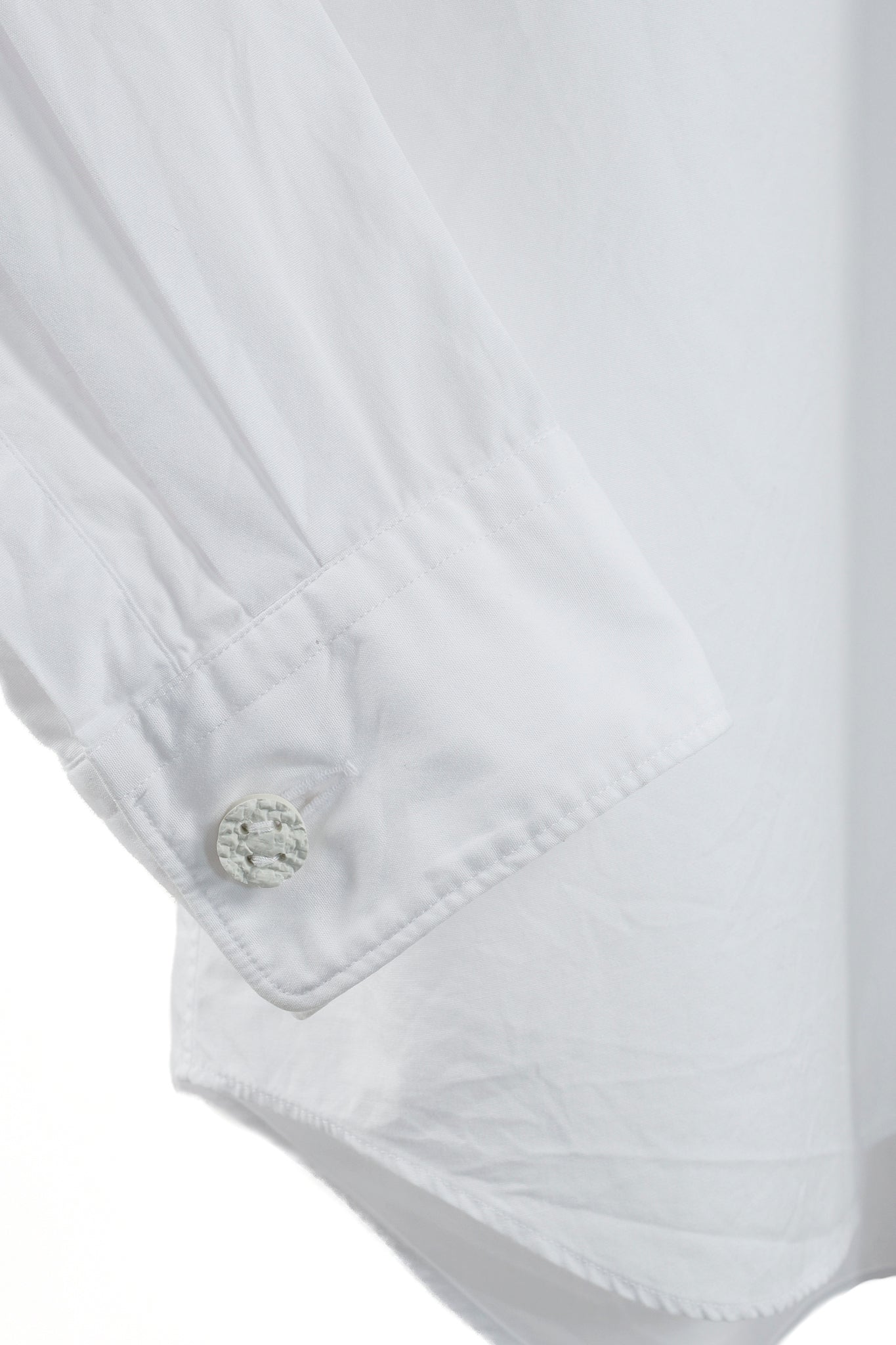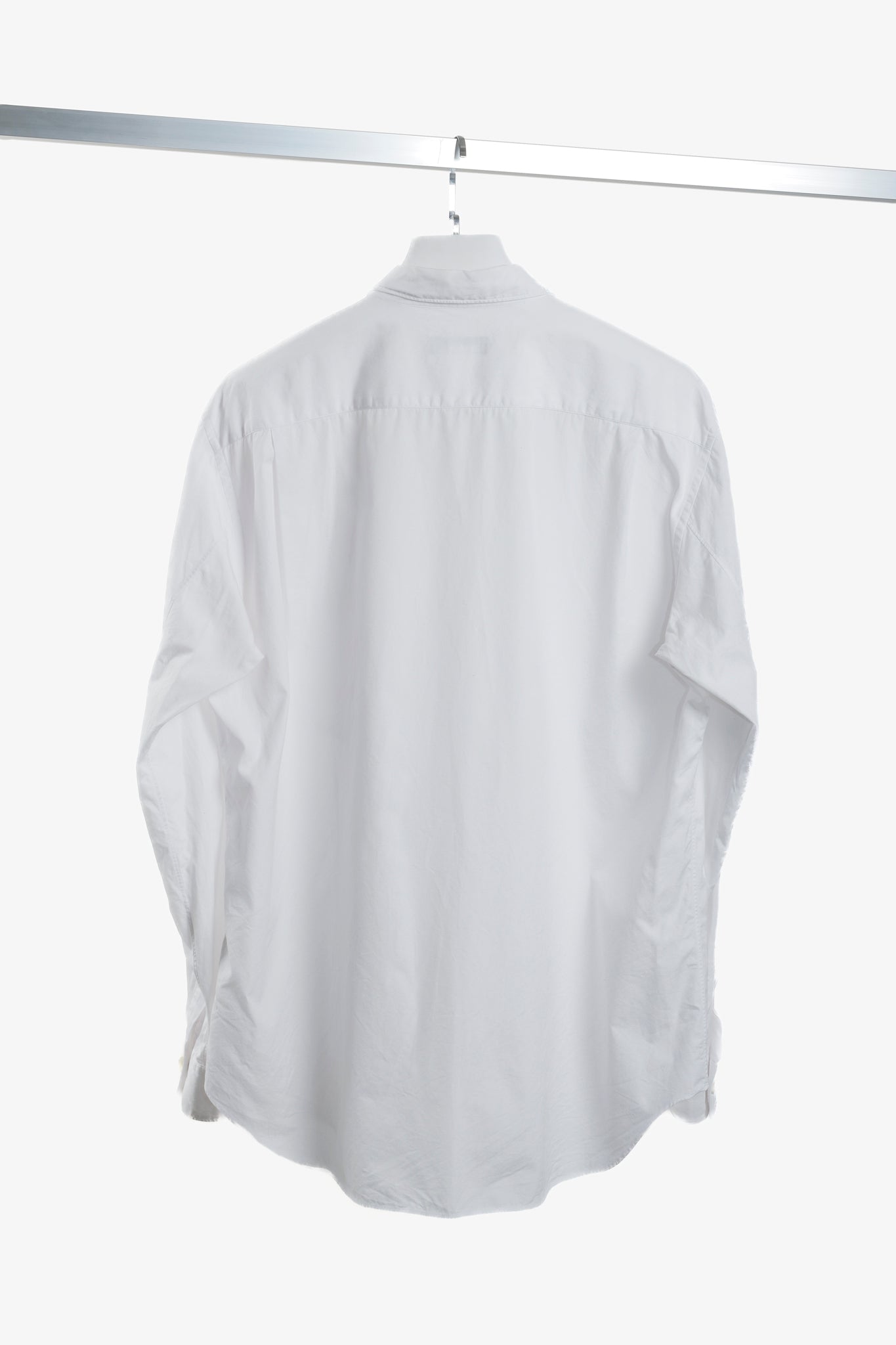 This 2012 studded button down shirt from Comme Des Garcon Homme Plus features a 100% cotton construction, 32 square studs vertically lining the left side of the shirt with a large breast pocket, dress shirt collar, rubber buttons on the cuff and front of the shirt, with a singular plastic collar button.