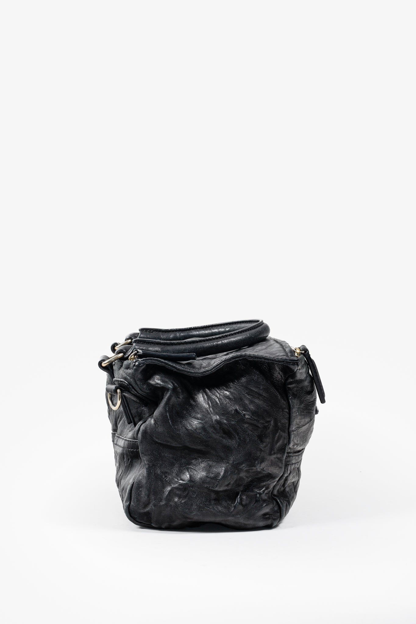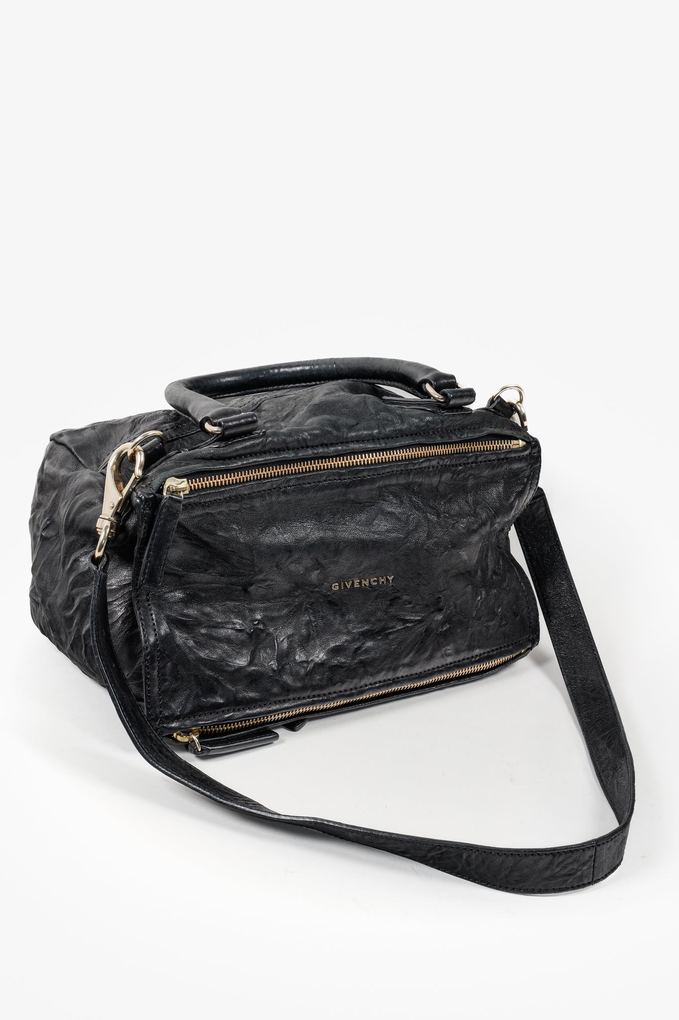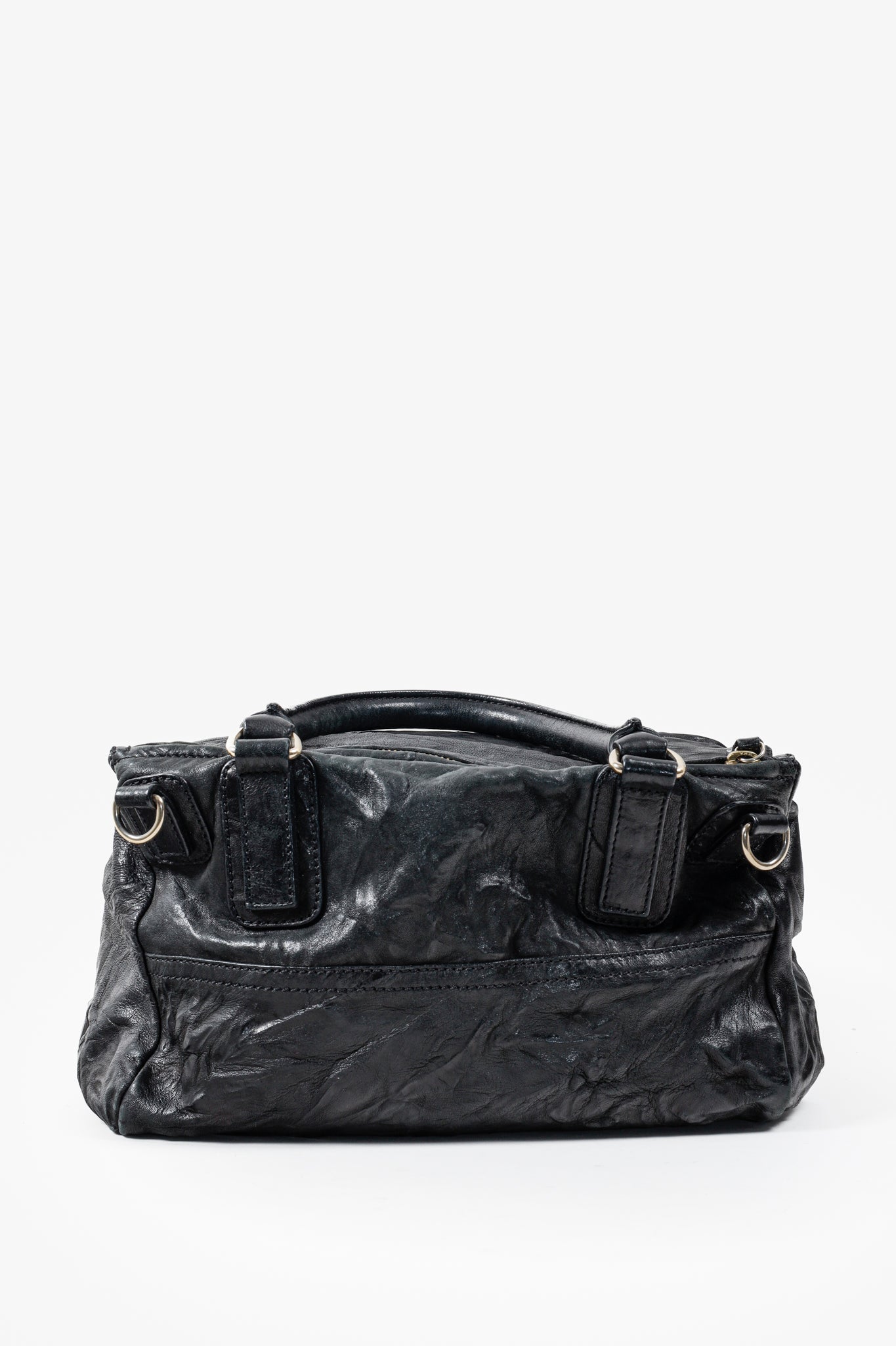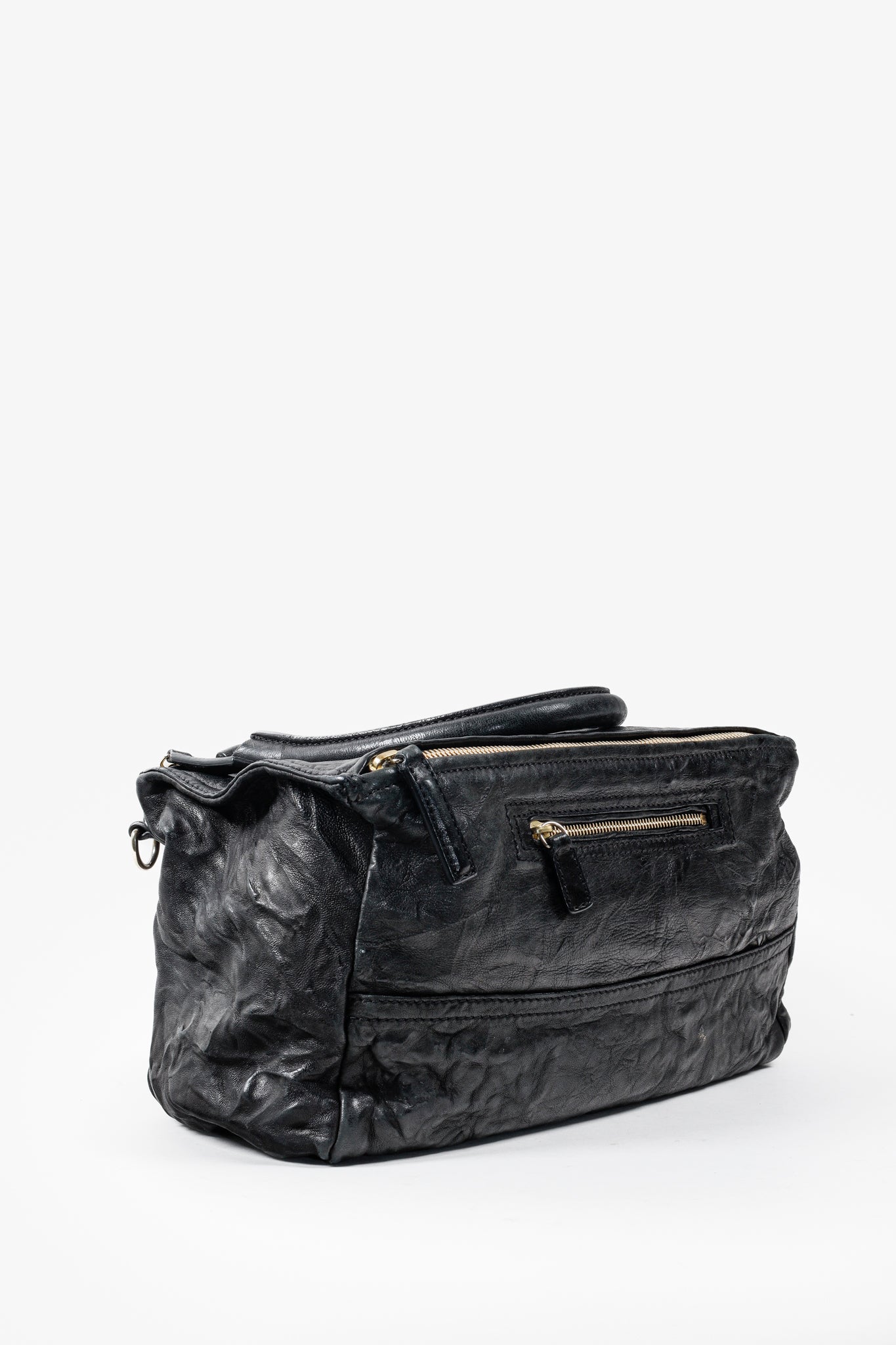 A black leather handbag from Givenchy that has purposefully been crinkled to create a distressed look. This bag features a rolled top handle, brass hardware, a detachable shoulder strap, two exterior zipper-fastened pockets, and a top zipper that opens into a spacious canvas-lined interior with two slip pockets and one zip pocket.