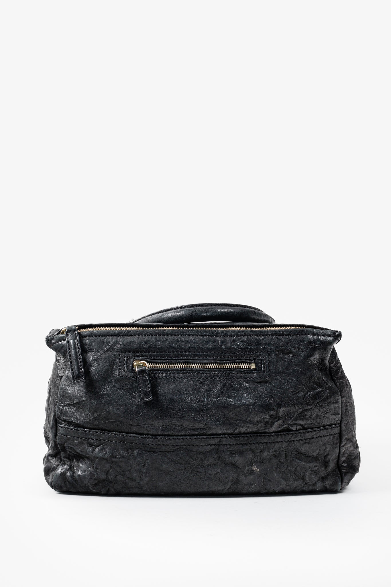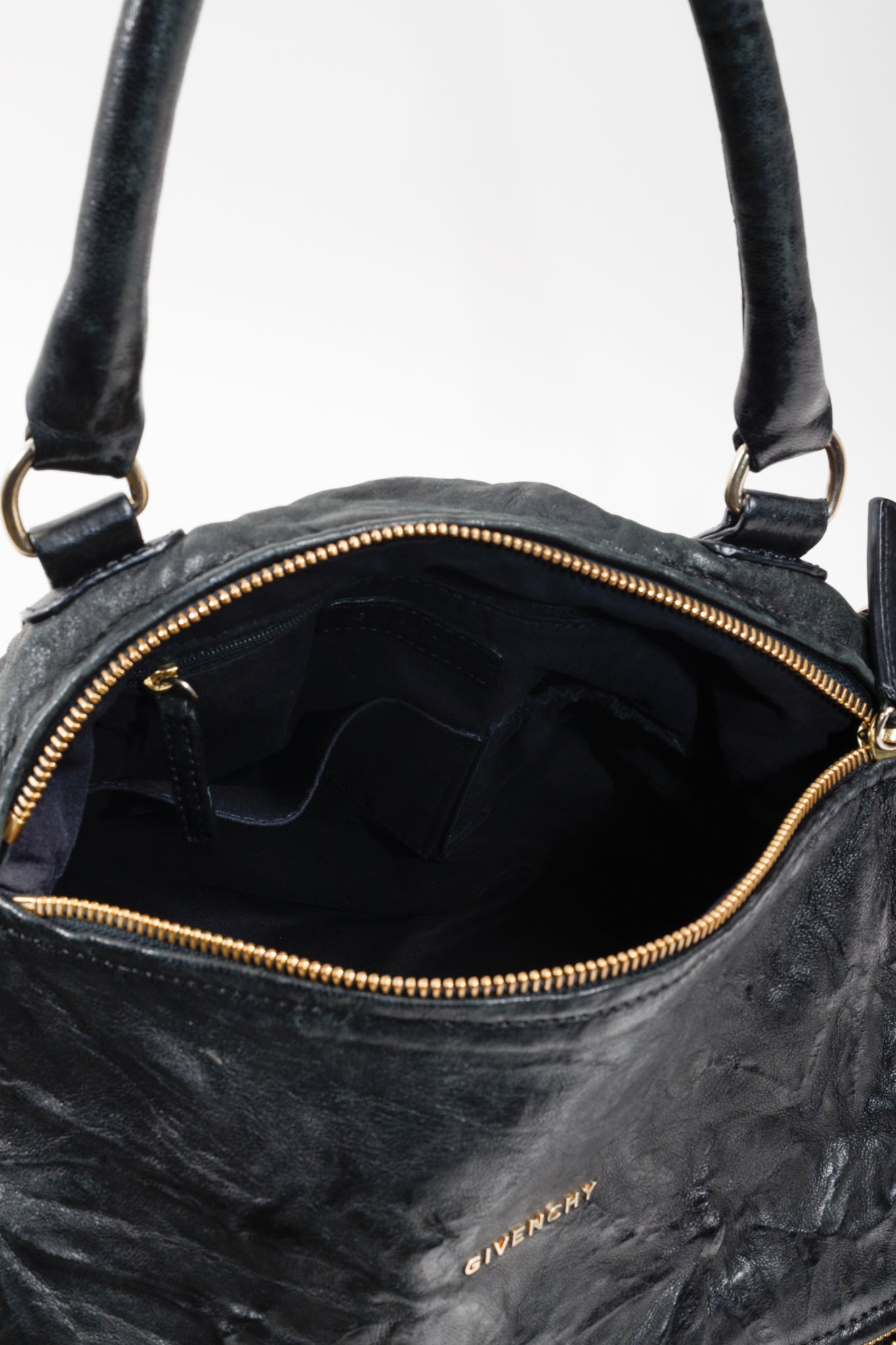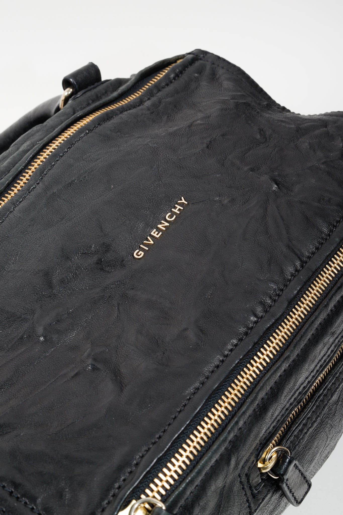 A black leather handbag from Givenchy that has purposefully been crinkled to create a distressed look. This bag features a rolled top handle, brass hardware, a detachable shoulder strap, two exterior zipper-fastened pockets, and a top zipper that opens into a spacious canvas-lined interior with two slip pockets and one zip pocket.