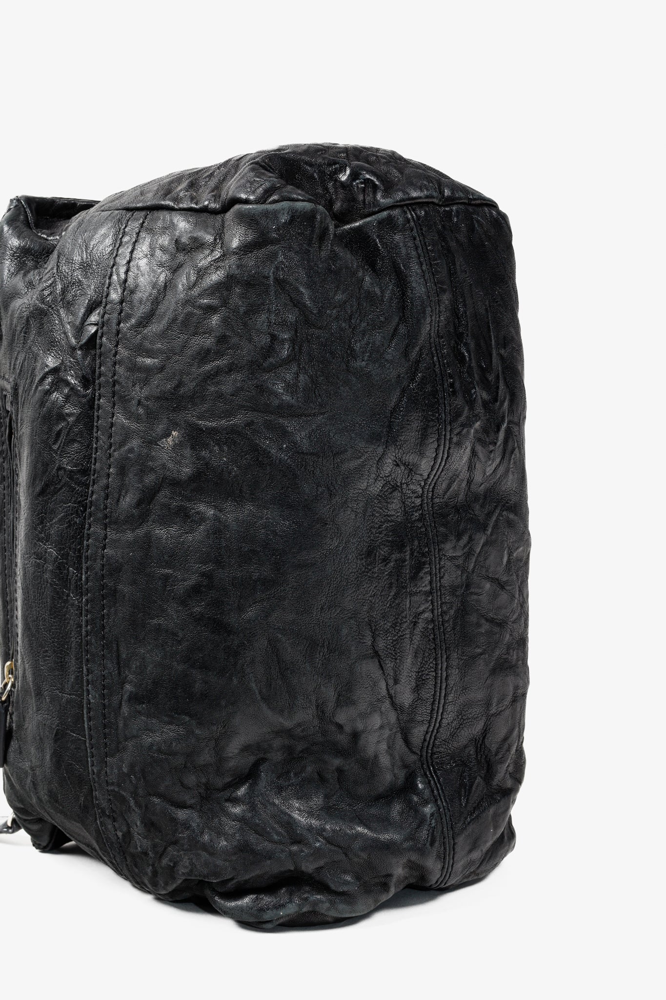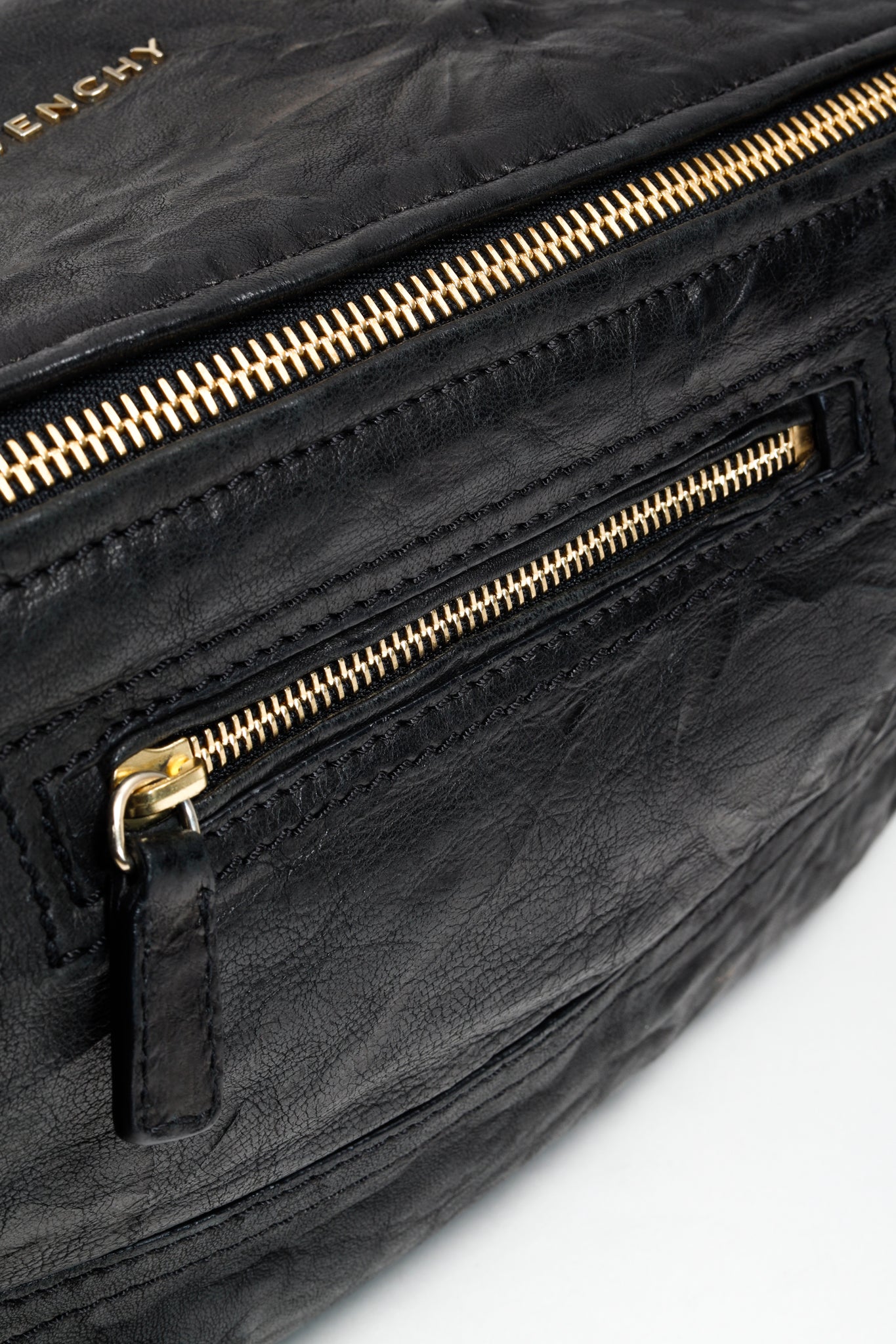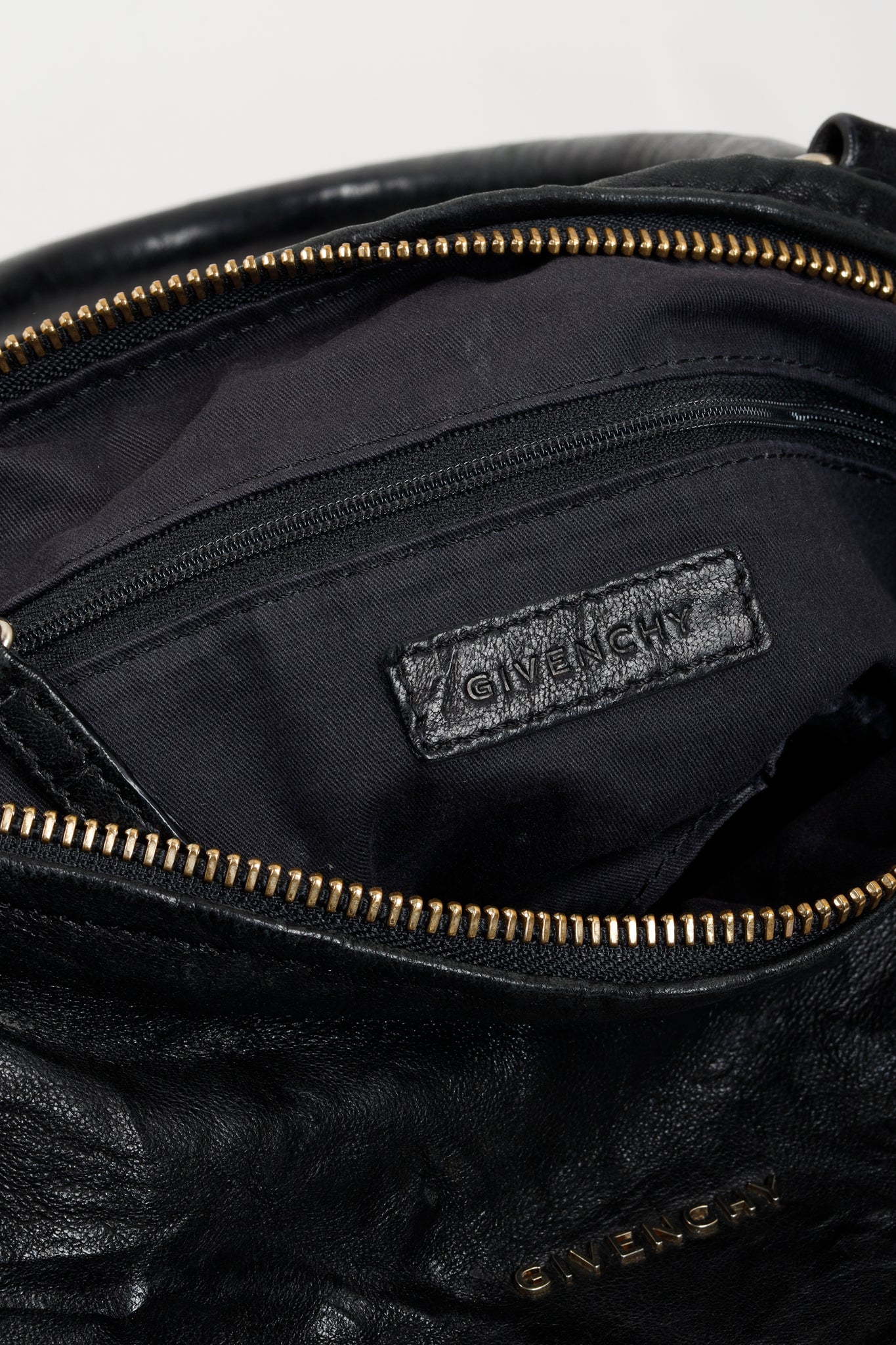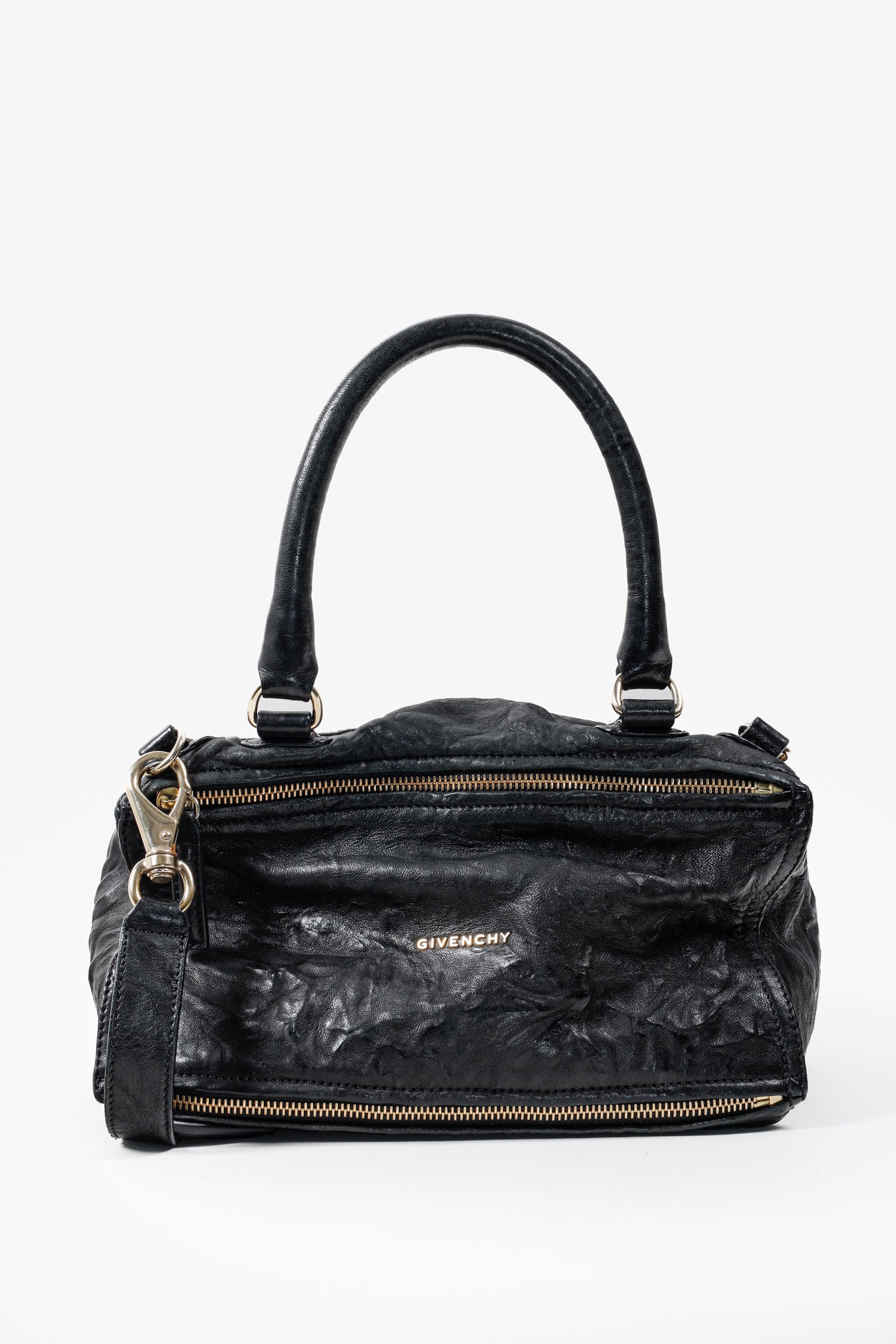 A black leather handbag from Givenchy that has purposefully been crinkled to create a distressed look. This bag features a rolled top handle, brass hardware, a detachable shoulder strap, two exterior zipper-fastened pockets, and a top zipper that opens into a spacious canvas-lined interior with two slip pockets and one zip pocket.