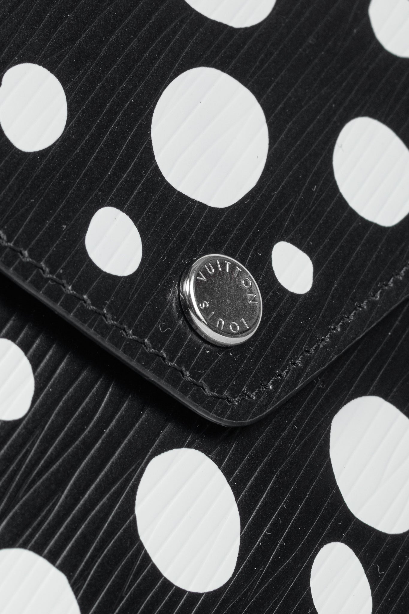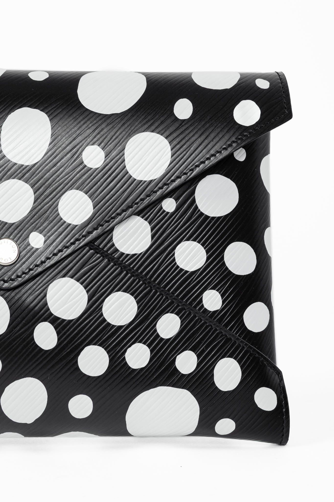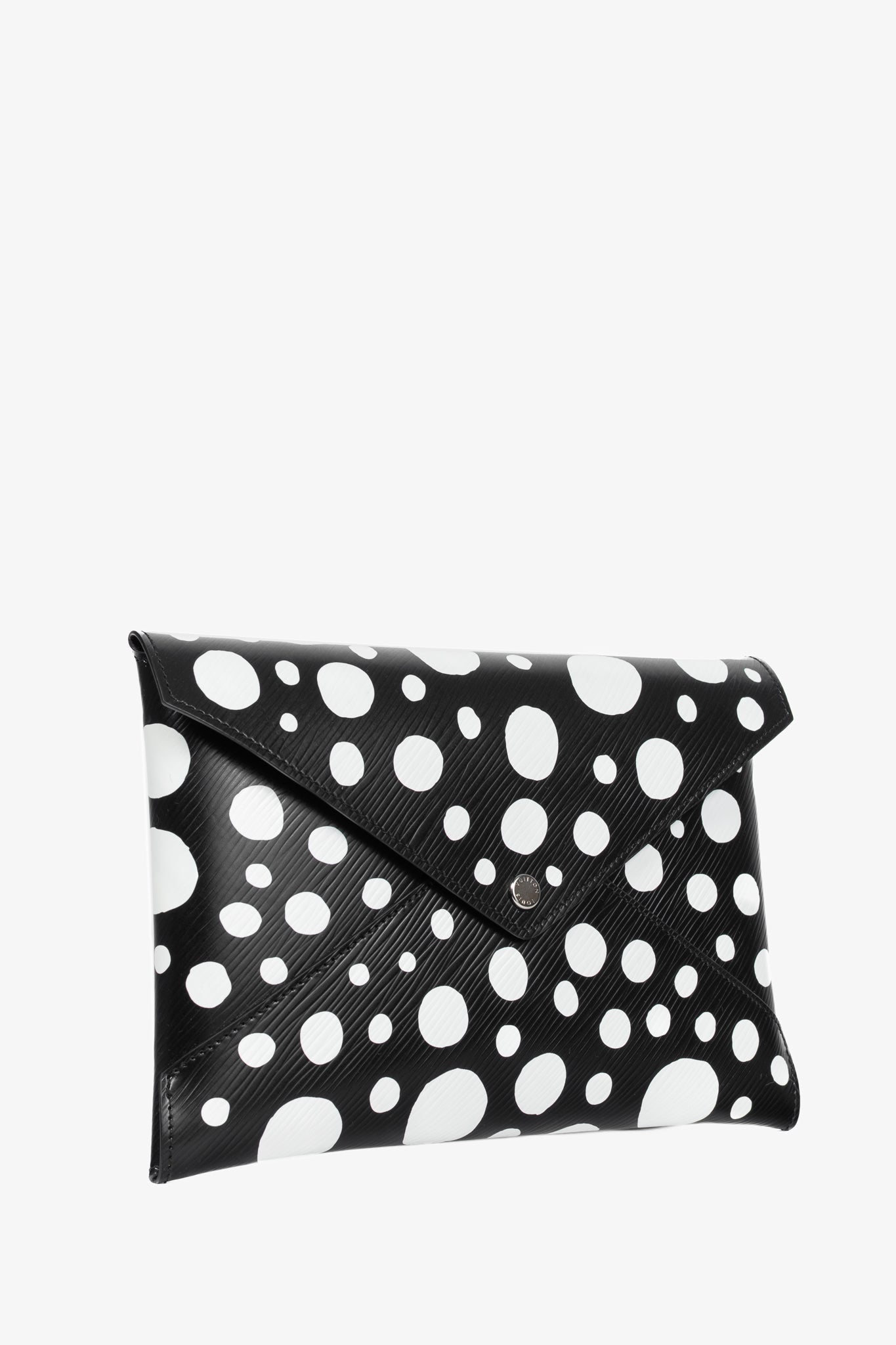 A collaboration piece between Louis Vuitton and Yayoi Kusama circa 2023, this Kirigami pochette is crafted in a Black epi leather with white dots, and features silver-tone hardware, an envelope construction, a snap closure on the front flap, and a tonal leather lining.