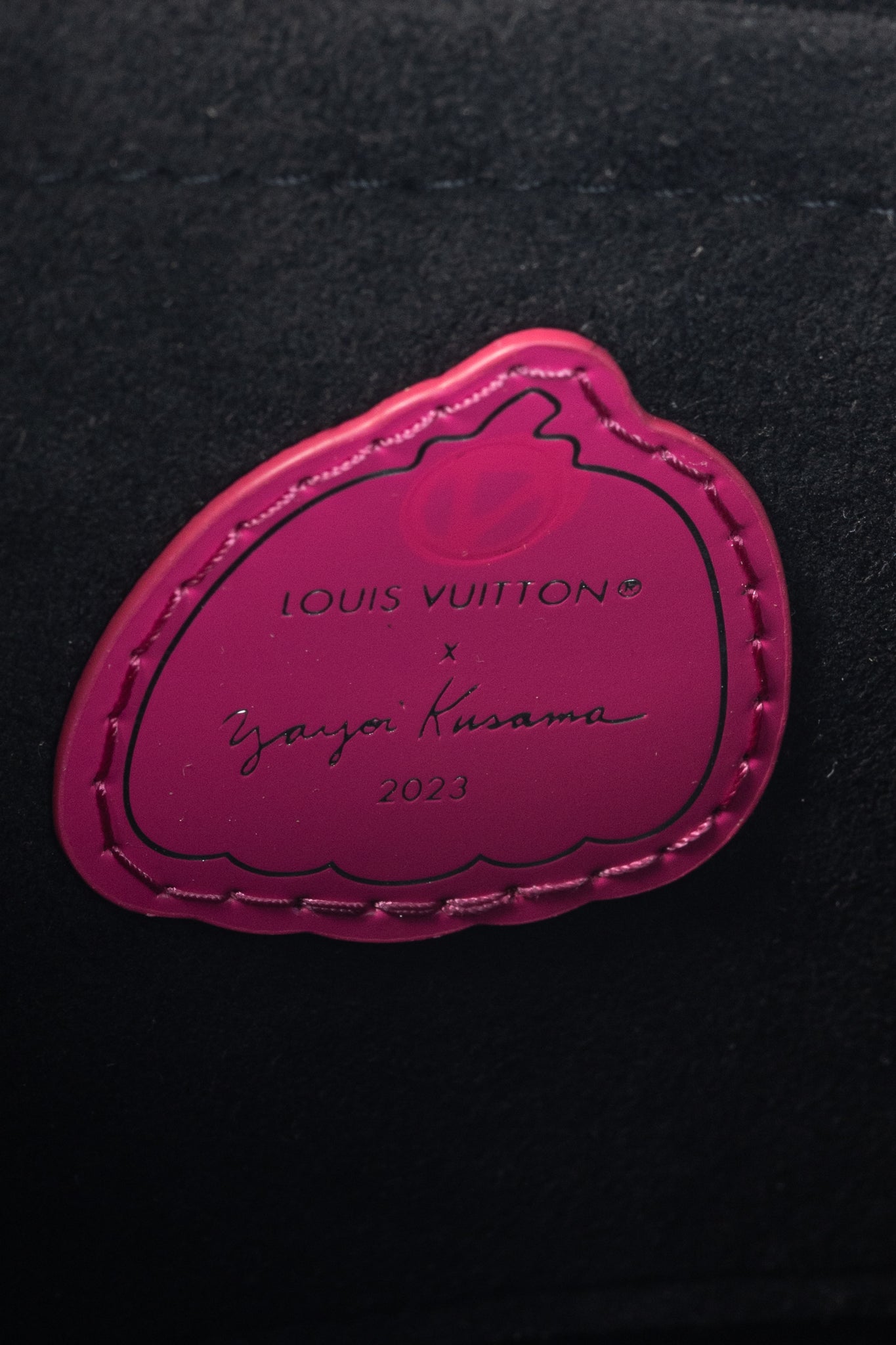 Made in France, this Multi Pochette Accessoires is a collaboration between Louis Vuitton and Yayoi Kusama for the former's 2023 Spring and Summer collection, and is crafted with a Black Monogram Empreinte leather in a Fuchsia Infinity Dots pattern. It features silver-tone hardware, a detachable chain shoulder strap, a detachable leather shoulder strap, hook closures to keep the two pouches together, a removable pumpkin-shaped charm, top zip closures, tonal microfiber lining, an interior slip pocket, and interior LV x YK signatures.
