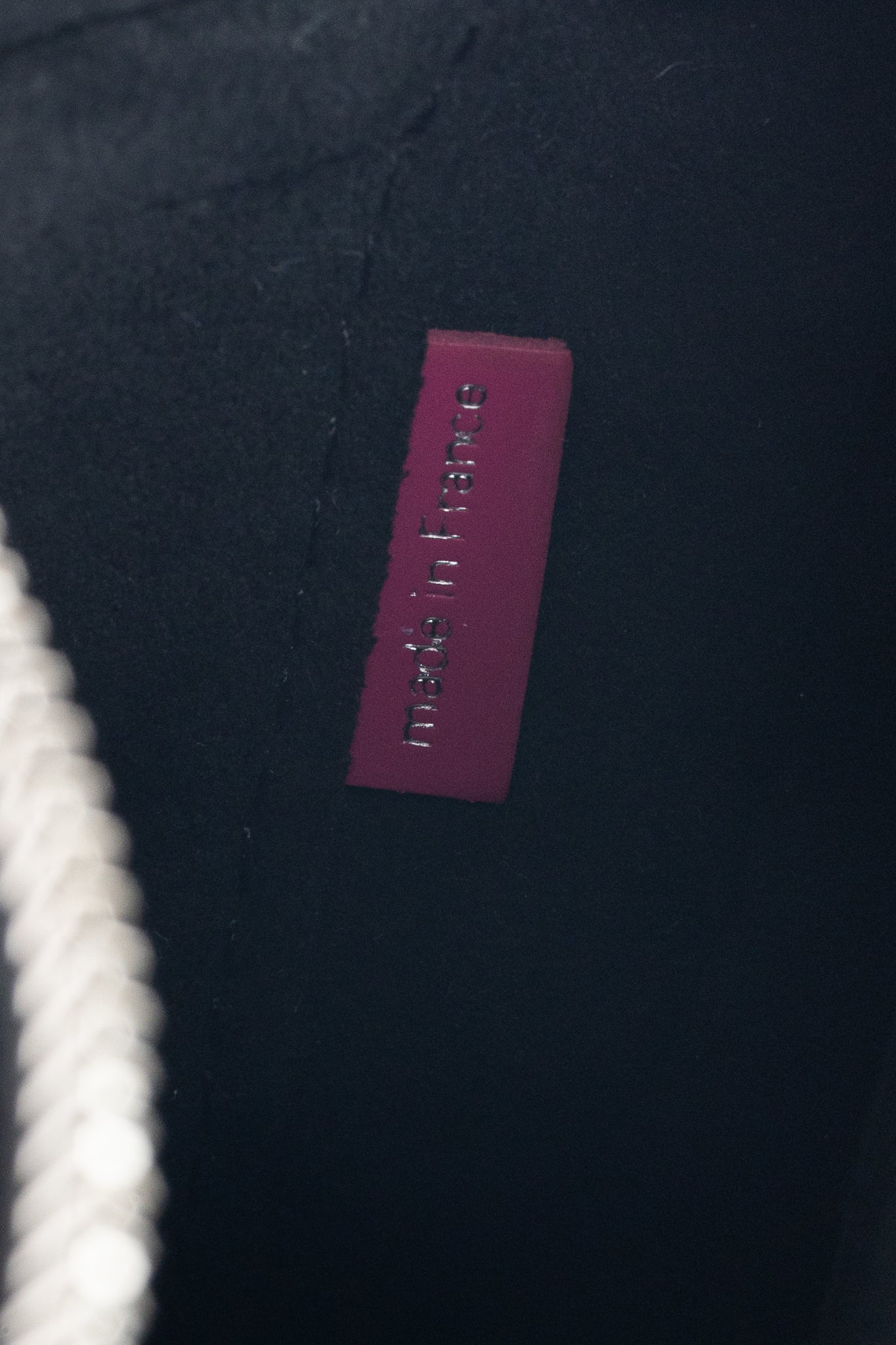 Composition: Cowhide exterior, fabric and cowhide interior, cowhide trim, metal hardware.