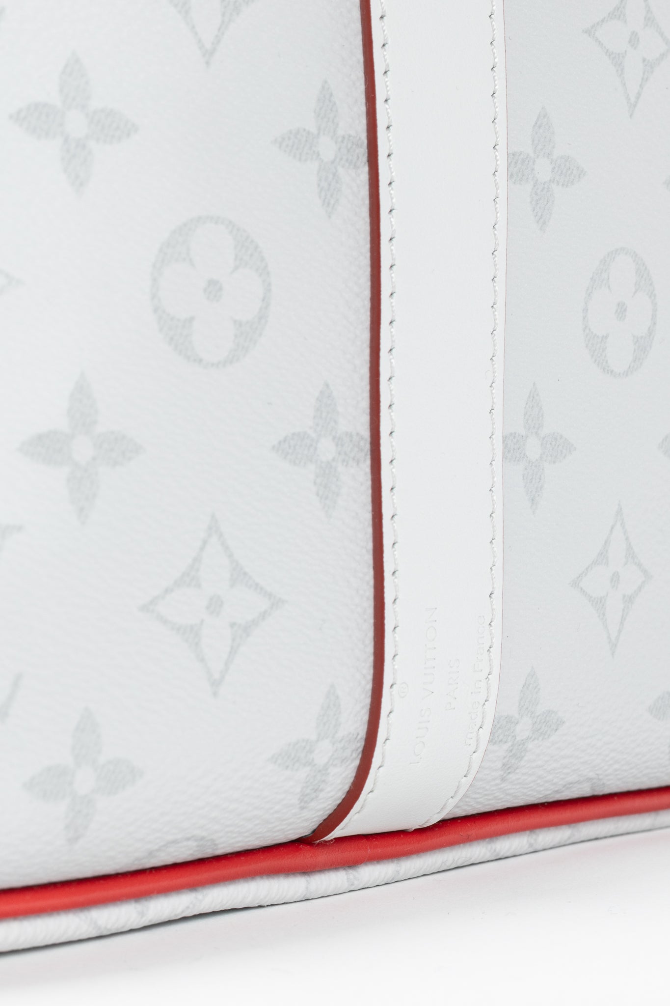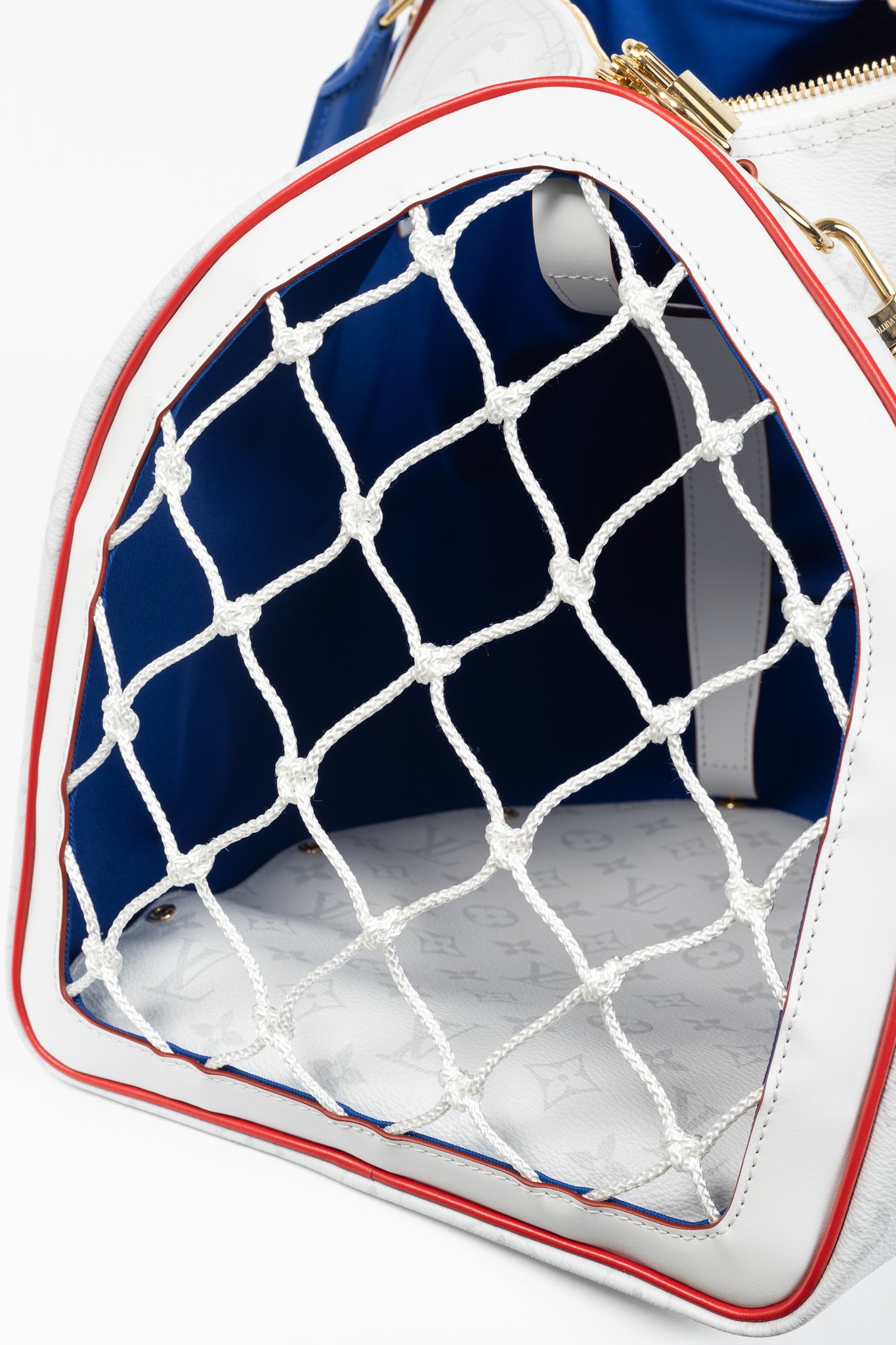 Made in France, this Keepall 55 Bandouliere Basketball duffle is a collaboration piece between Louis Vuitton and NBA circa 2020, and is crafted with a Monogram coated canvas in an Antarctica white. It features leather trim in white, blue, and red; gold-tone hardware, two top rolled handles, a detachable and adjustable leather shoulder strap, a detachable tag, a padlock, and a mesh-trimmed side with a removable inner panel. Secured with two pulls, the top zip closure opens to a blue textile-lined interior, and contains a single zip pocket.