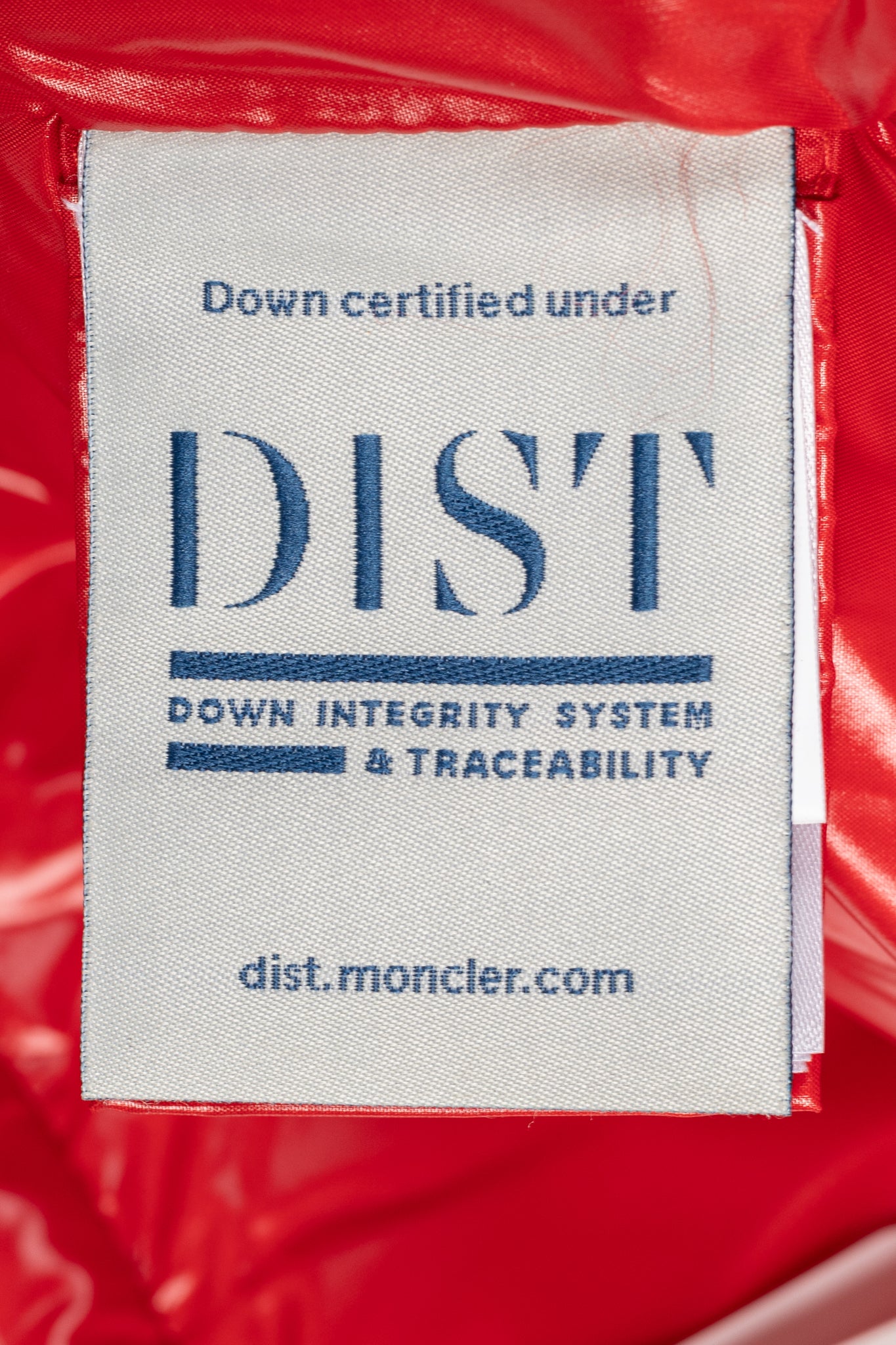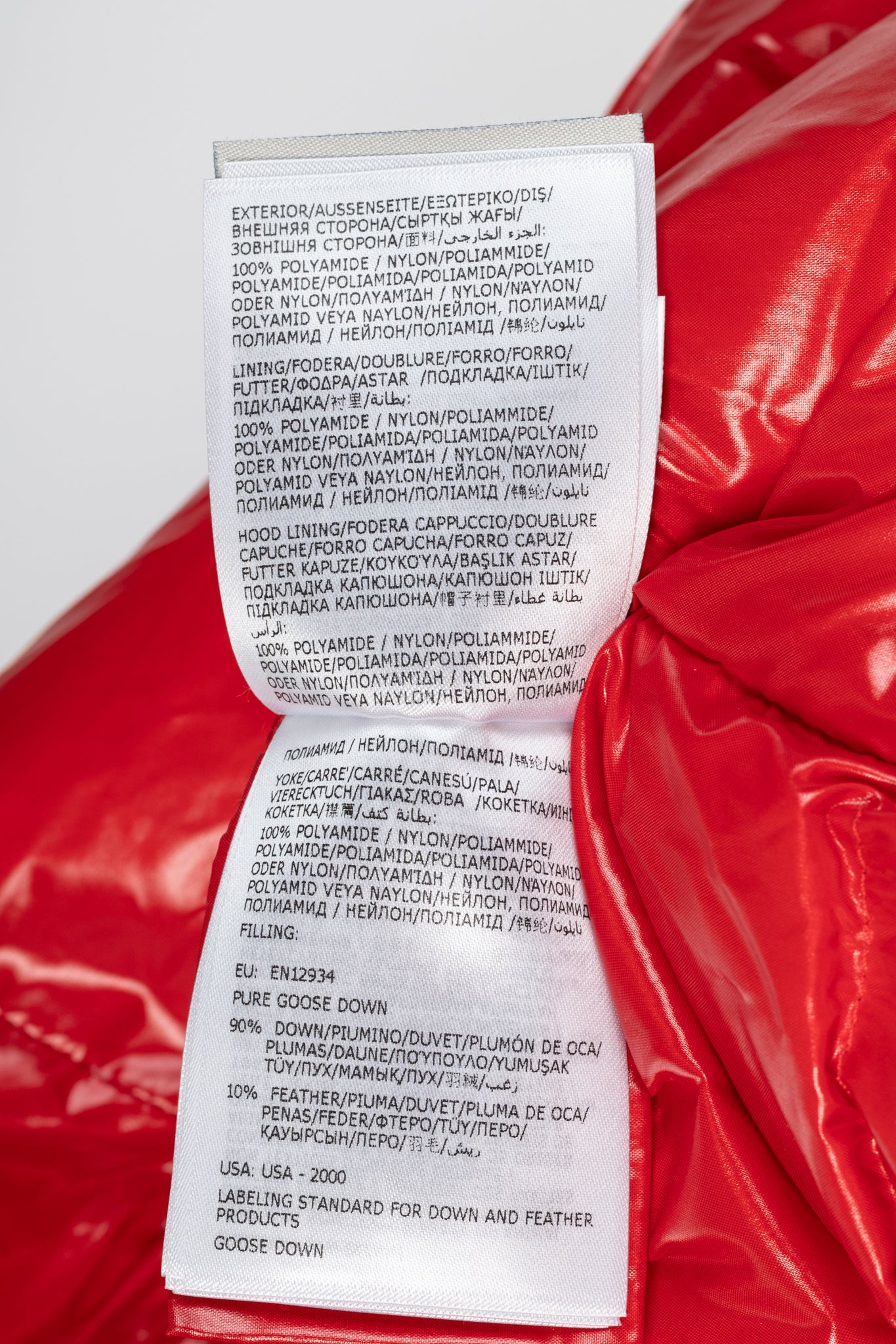 Made in Armenia, this Etival jacket from Moncler circa 2022 is made with a matte Red quilted nylon taffeta filled with goose down, and is trimmed with a tonal shiny nylon on the hood and yokes. It features long sleeves with zips on the undersides, elasticated cuffs, a funnel neck with a drawcord hood, a front two-way zip fastening with a snap placket, two front snap pockets, drawcords on the back yoke and hem, tonal nylon lining; and is embellished with an embroidered beige, navy and red brand patch on the sleeve.