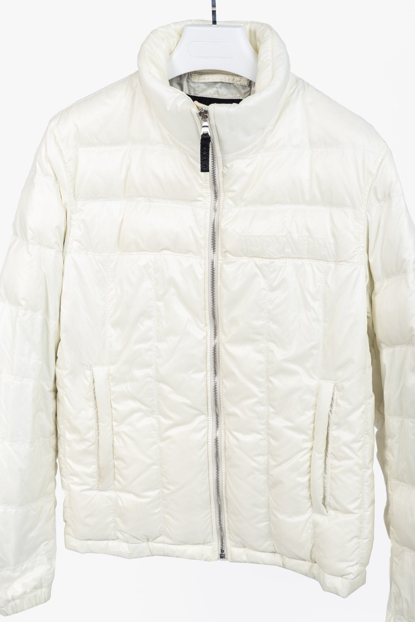 Made in Romania, this puffer from Prada circa 2007 is crafted in a cream quilted nylon, and is insulated in a soft down. It features long sleeves, elasticized cuffs with snap closures, a mock neck, a front zip closure, a tonal embroidered logo on the left chest, front zip pockets, an interior pocket, and black nylon lining.