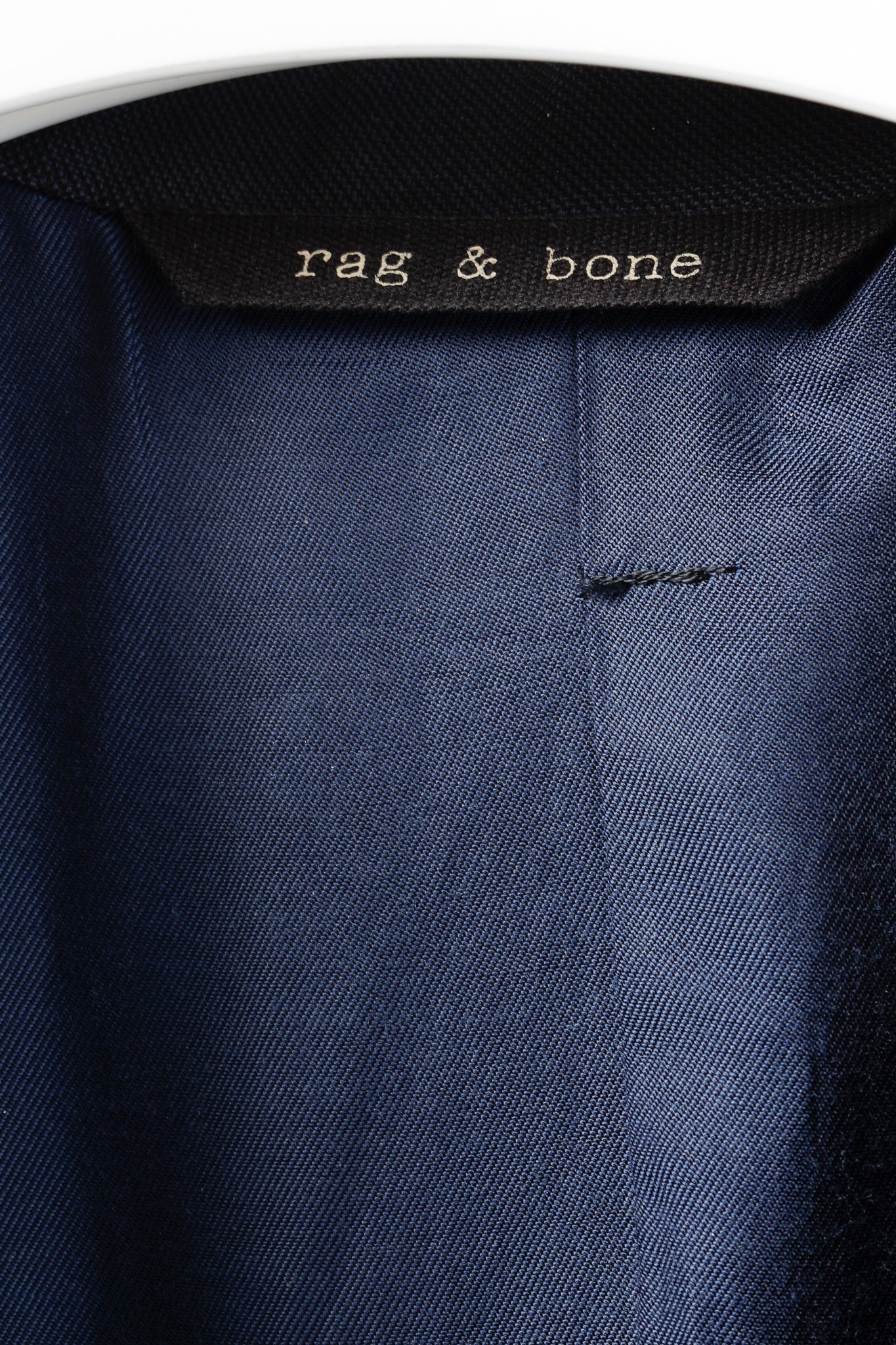 This tailored blazer from Rag & Bone is crafted in a navy blue wool suiting, and features long sleeves, buttoned cuffs, padded shoulders, a notched lapel collar, front button closures, a welted tuxedo chest pocket, front button closures, front flap pockets, a vented back, interior pockets; and is lined in a blue fabric on the bodice, and a white and grey striped satin on the sleeves.